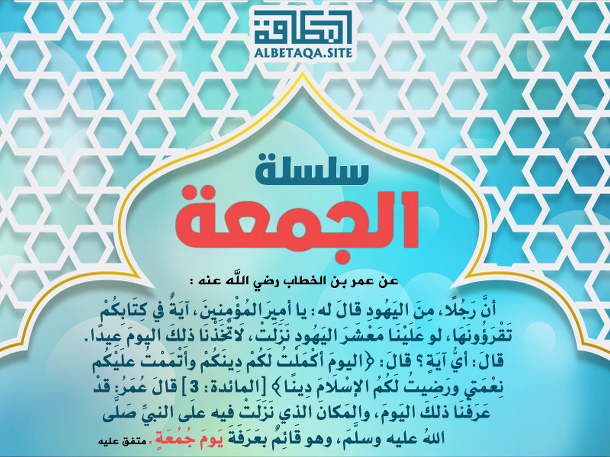 (أن رجلا، من اليهود قال له: يا أمير المؤمنين، آية في كتابكم تقرؤونها، لو علينا معشر اليهود نزلت، لاتخذنا ذلك اليوم عيدا. قال: أي آية؟ قال: {اليوم أكملت لكم دينكم وأتممت عليكم نعمتي ورضيت لكم الإسلام دينا} [المائدة: 3] قال عمر: قد عرفنا ذلك اليوم، والمكان الذي نزلت فيه على النبي صلى الله عليه وسلم، وهو قائم بعرفة يوم جمعة). متفق عليه