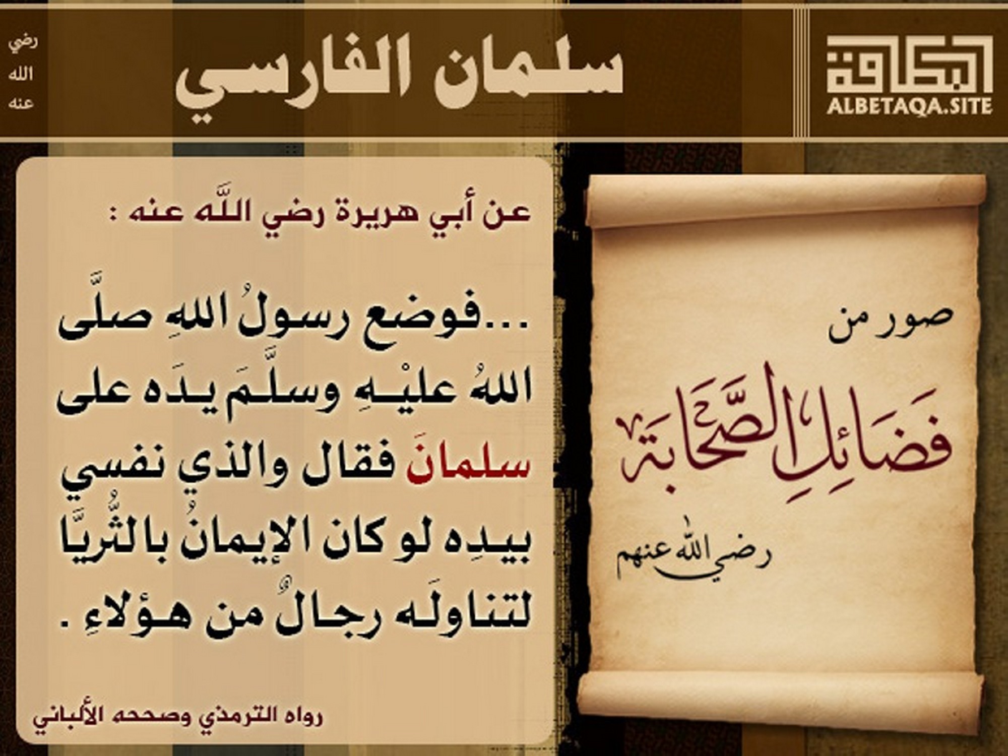 (….وفينا سلمان الفارسي قال: فوضع النبي صلى الله عليه وسلم يده على سلمان، ثم قال: لو كان الإيمان عند الثريا، لناله رجال من هؤلاء). متفق عليه