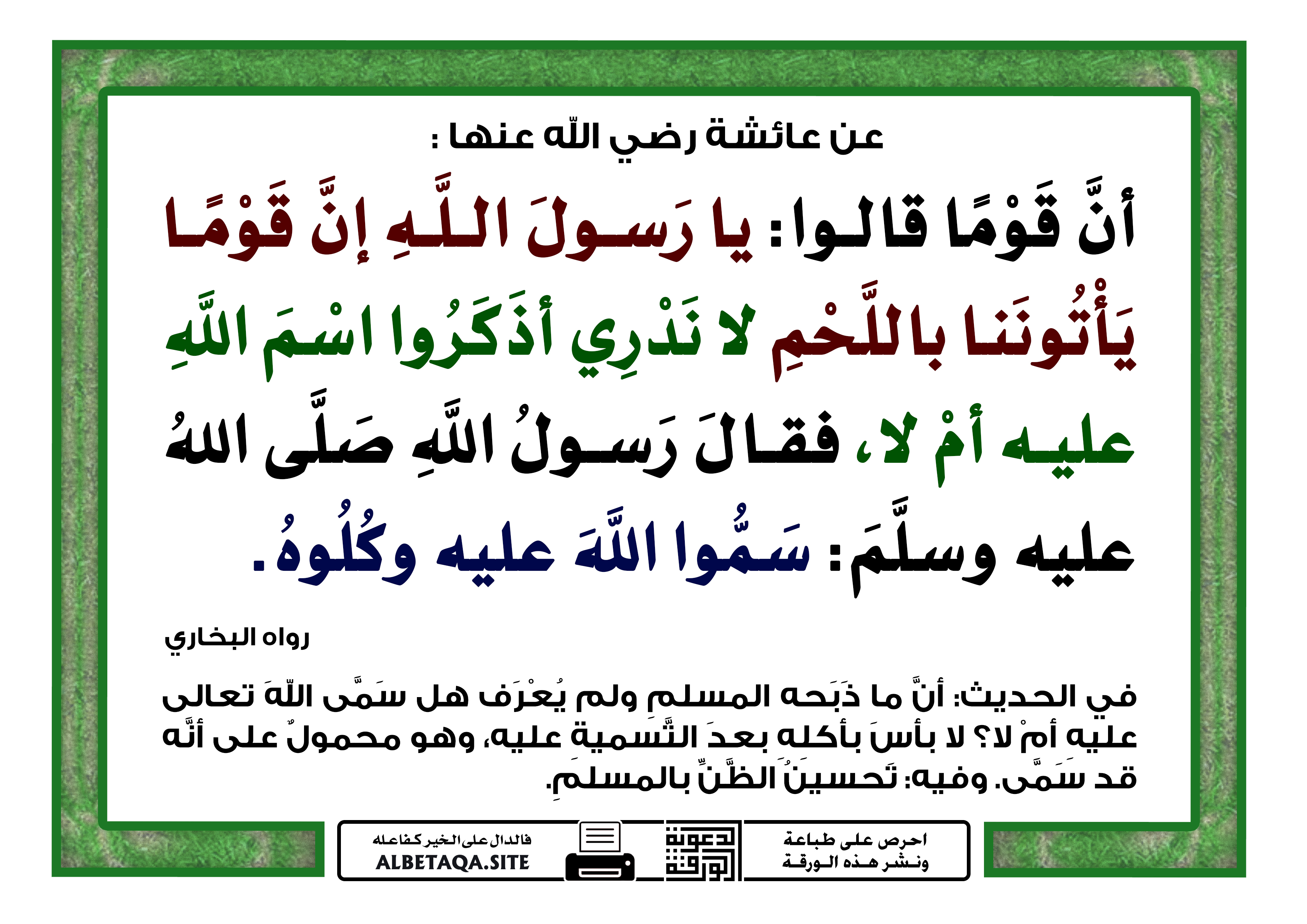 أن قوما قالوا: يا رسول الله إن قوما يأتوننا باللحم لا ندري أذكروا اسم الله عليه أم لا، فقال رسول الله صلى الله عليه وسلم: سموا الله عليه وكلوه. رواه البخاري