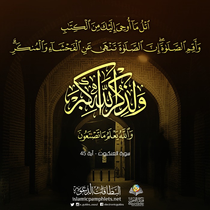 تصميم بطاقة آية (وَلَذِكْرُ اللَّهِ أَكْبَرُ ۗ وَاللَّهُ يَعْلَمُ مَا تَصْنَعُونَ ﴿٤٥﴾) سورة " العنكبوت " الآية رقم (٤٥)