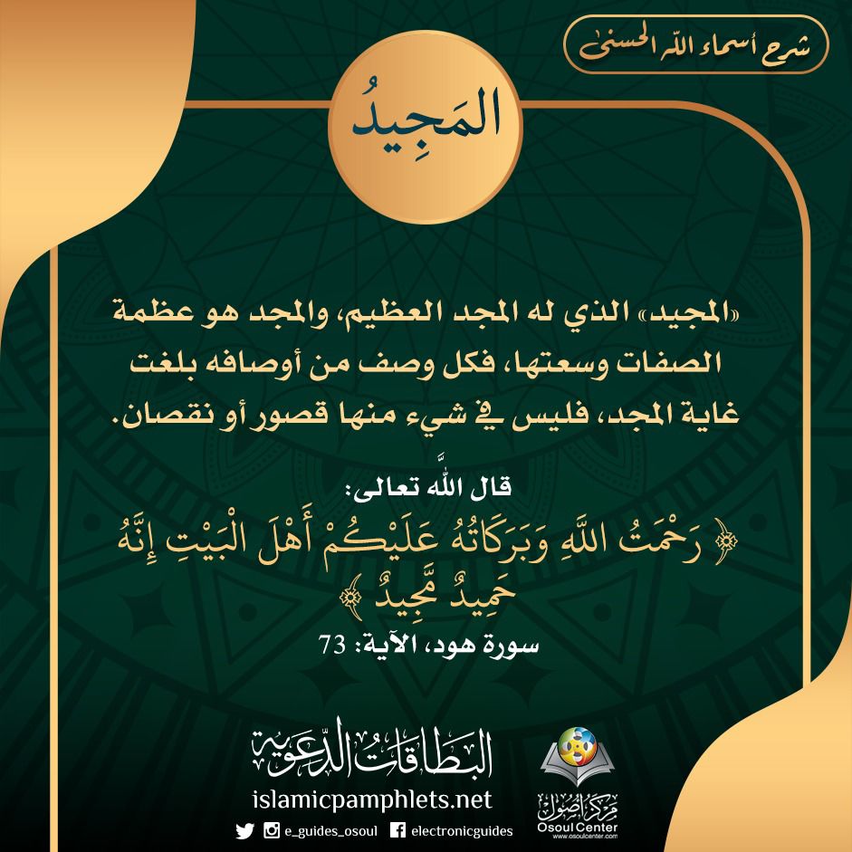 «المجيد» الذي له المجد العظيم، والمجد هو عظمة الصفات وسعتها، فكل وصف من أوصافه بلغت غاية المجد، فليس في شيء منها قصور أو نقصان.