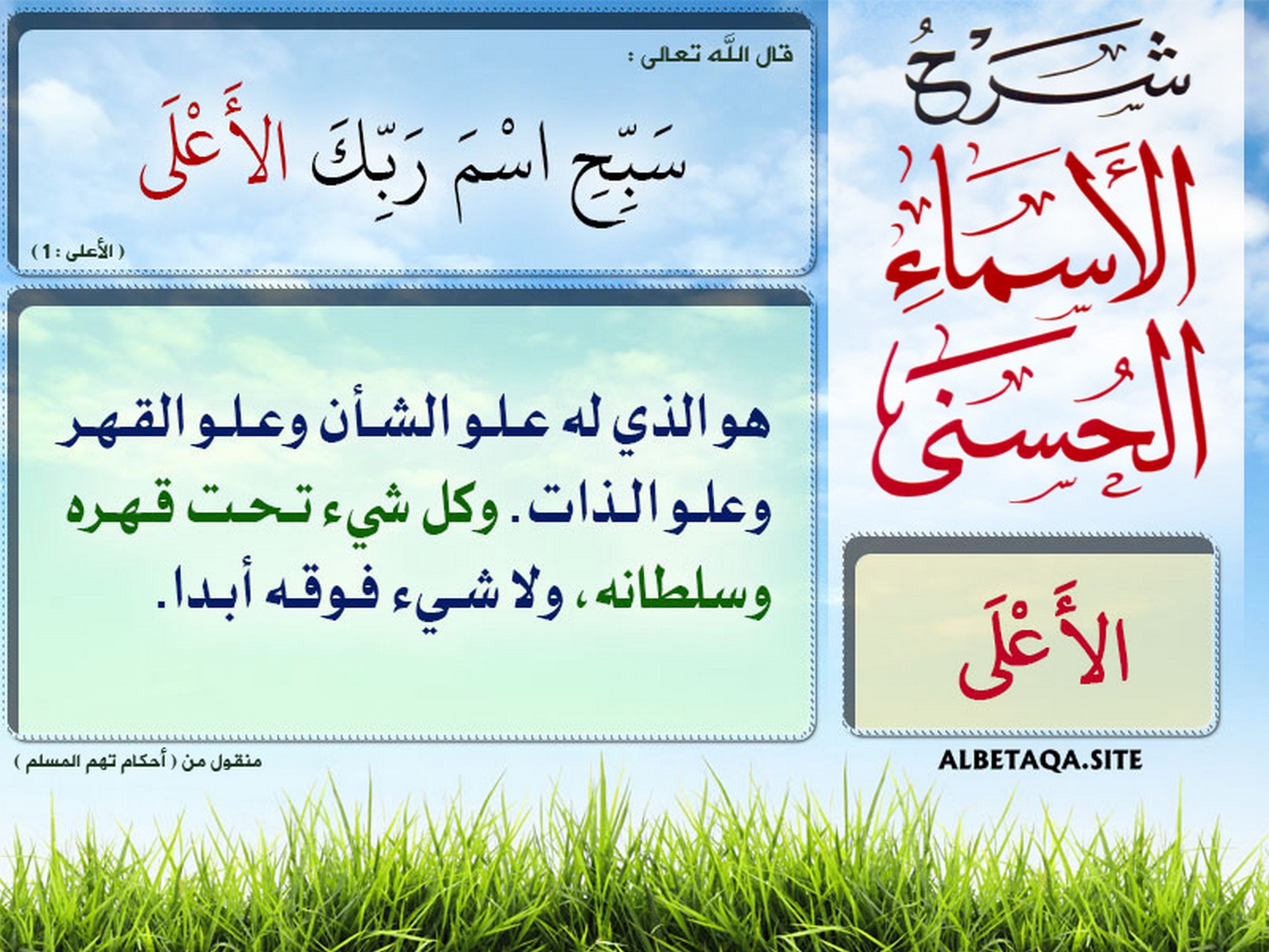 الأعلى: هو الذي له علو الشأن وعلو القهر وعلو الذات. وكل شيء تحت قهره وسلطانه، ولا شيء فوقه أبدا. منقول من (أحكام تهم المسلم)