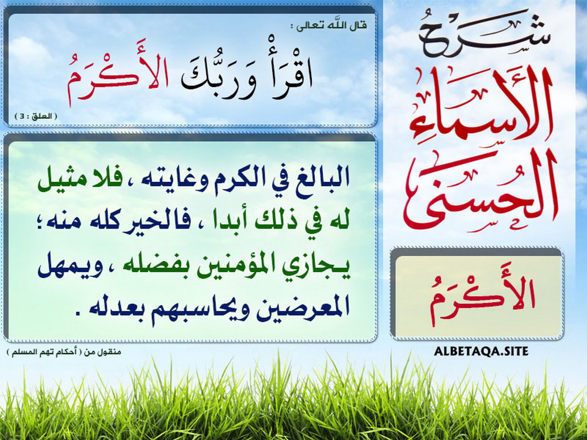 الأكرم: البالغ في الكرم وغايته، فلا مثيل له في ذلك أبدا، فالخير كله منه؛ يجازي المؤمنين بفضله، ويمهل المعرضين ويحاسبهم بعدله. منقول من (أحكام تهم المسلم)