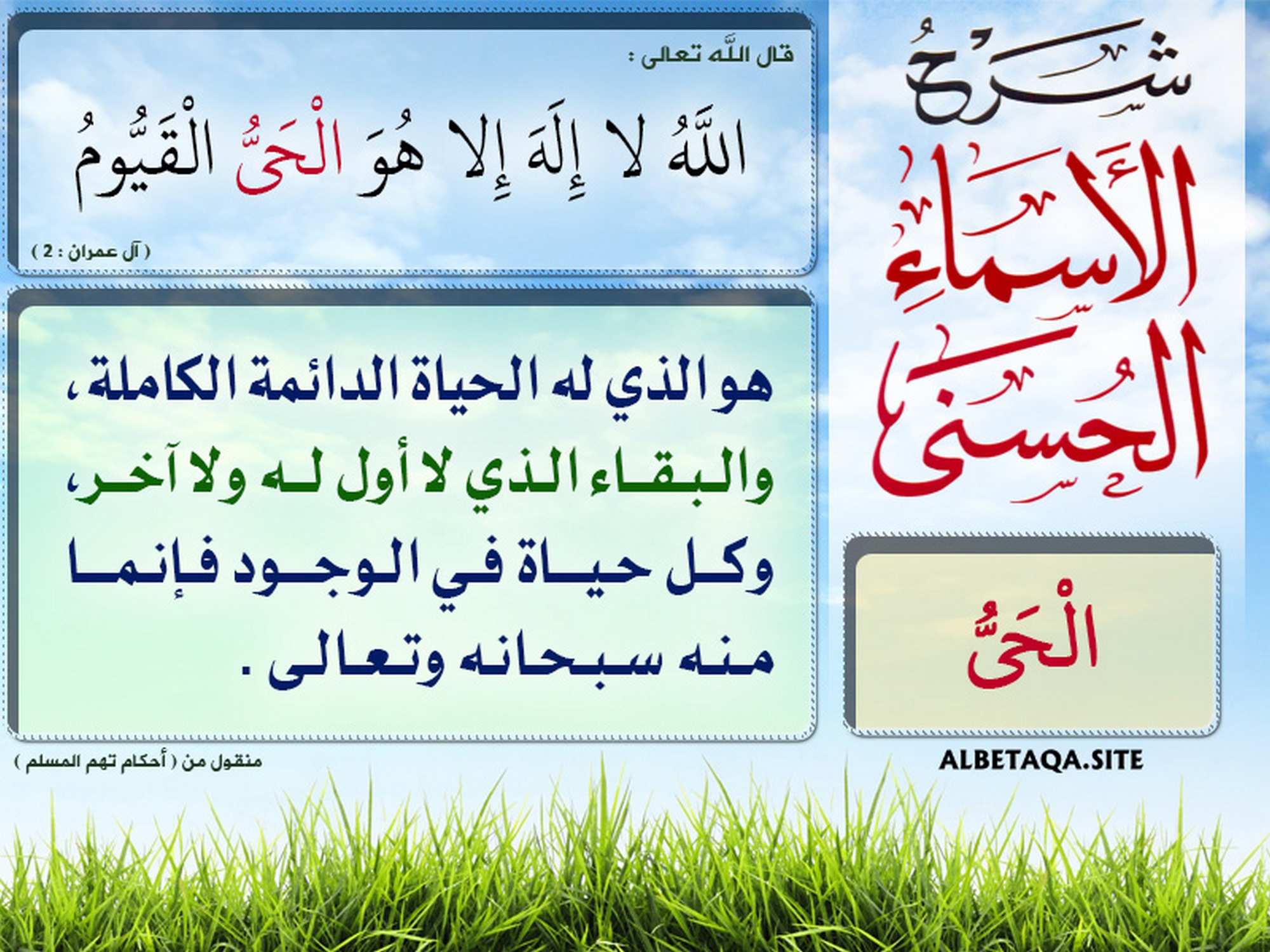 الحي: هو الذي له الحياة الدائمة الكاملة، والبقاء الذي لا أول له ولا آخر، وكل حياة في الوجود فإنما منه سبحانه وتعالى. منقول من (أحكام تهم المسلم)