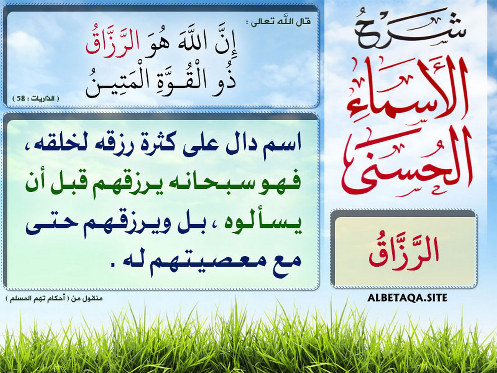الرزاق: اسم دال على كثرة رزقه لخلقه، فهو سبحانه يرزقهم قبل أن يسألوه، بل ويرزقهم حتى مع معصيتهم له. منقول من (أحكام تهم المسلم)