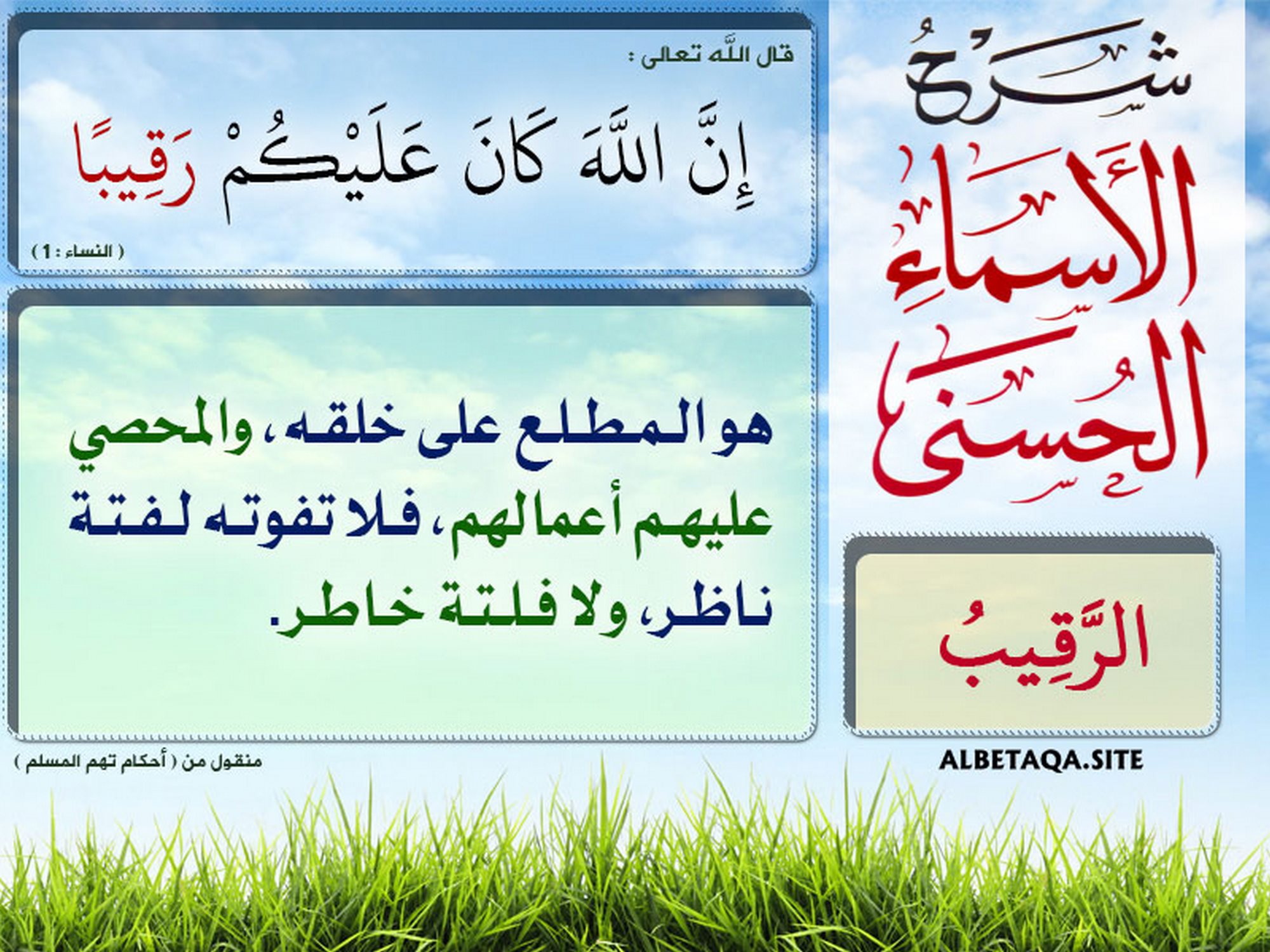الرقيب: هو المطلع على خلقه، والمحصي عليهم أعمالهم، فلا تفوته لفتة ناظر، ولا فلتة خاطر. منقول من (أحكام تهم المسلم)