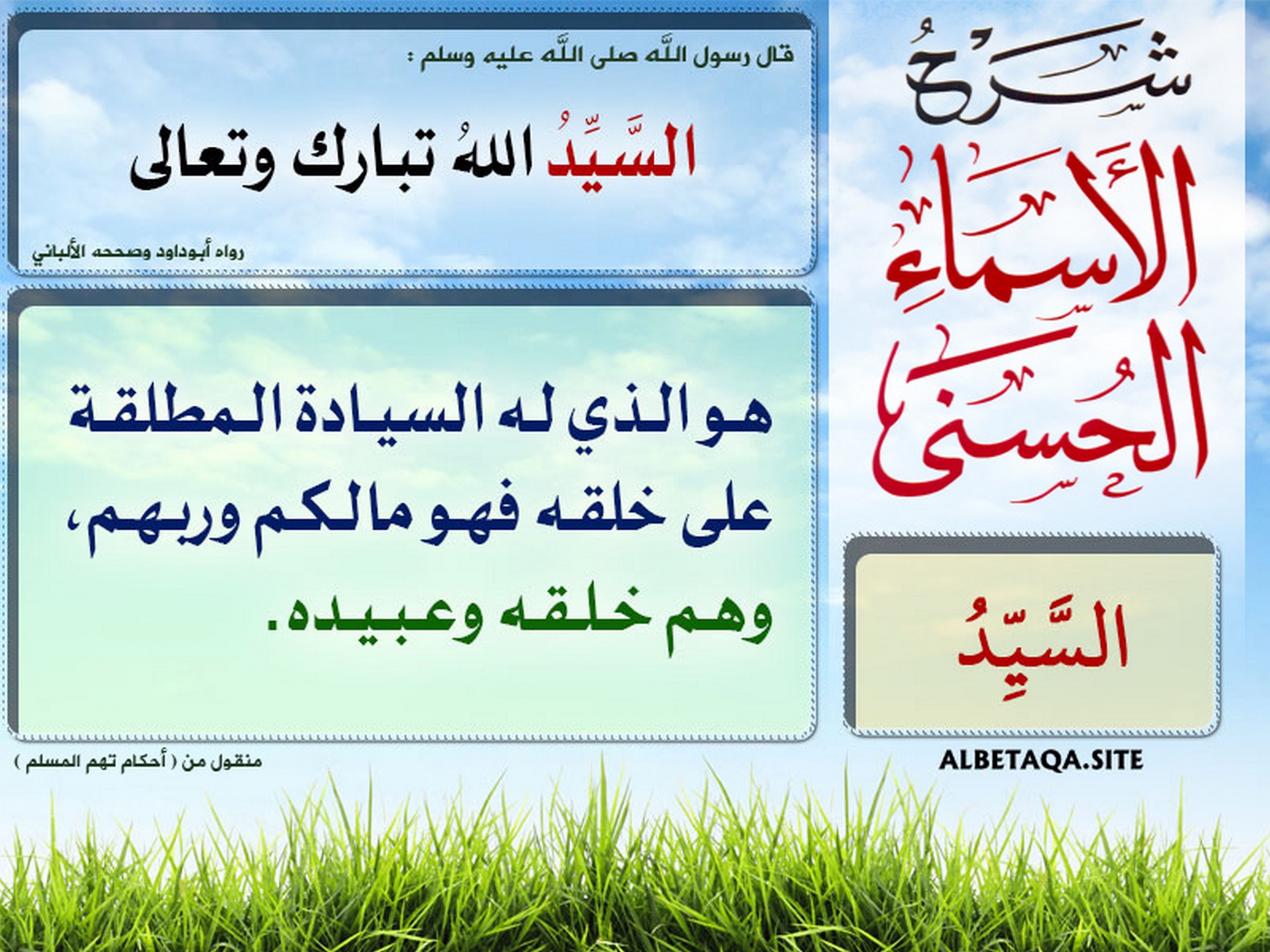 السيد: هو الذي له السيادة المطلقة على خلقه فهو مالكهم وربهم، وهم خلقه وعبيده. منقول من (أحكام تهم المسلم)