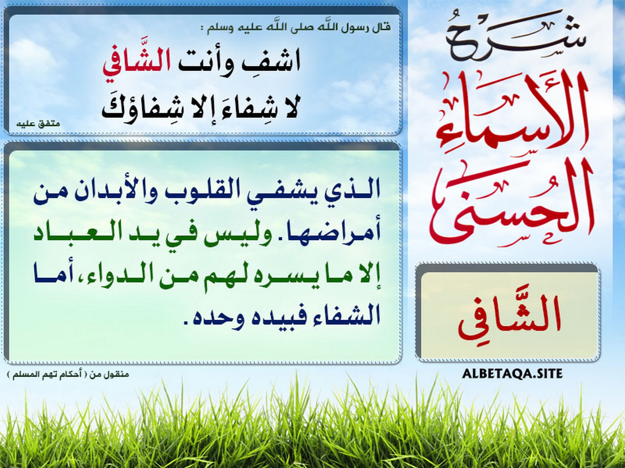 الشافي: الذي يشفي القلوب والأبدان من أمراضها. وليس في يد العباد إلا ما يسره لهم من الدواء، أما الشفاء فبيده وحده. منقول من (أحكام تهم المسلم)
