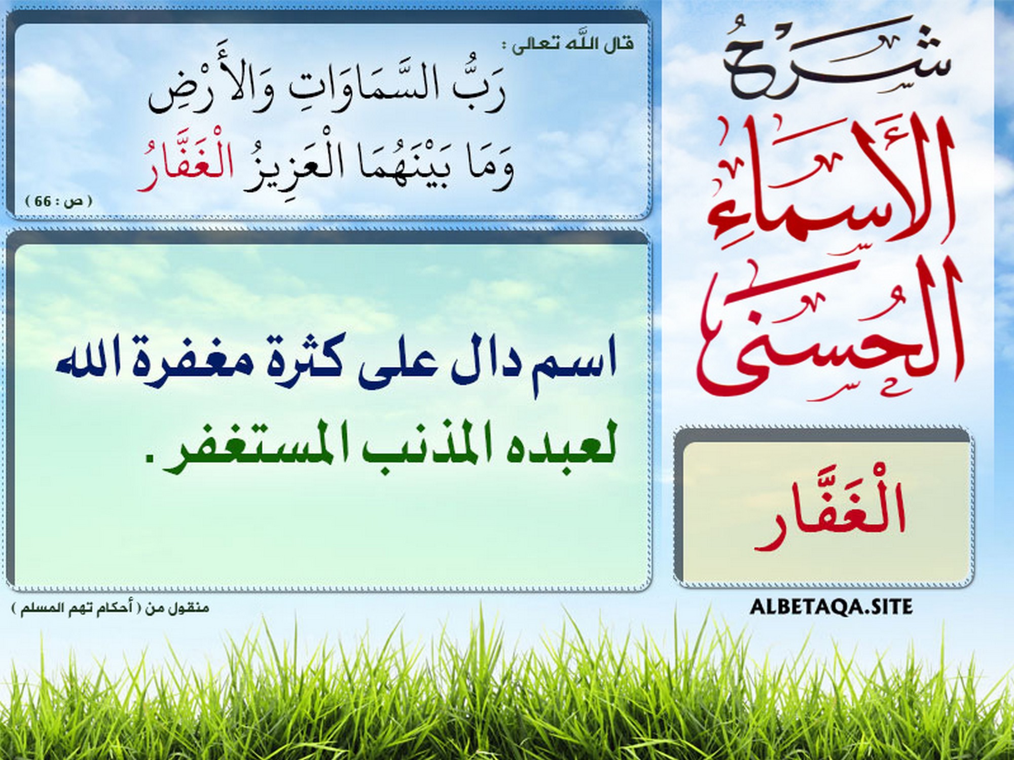 الغفار: اسم دال على كثرة مغفرة الله لعبده المذنب المستغفر. منقول من (أحكام تهم المسلم)
