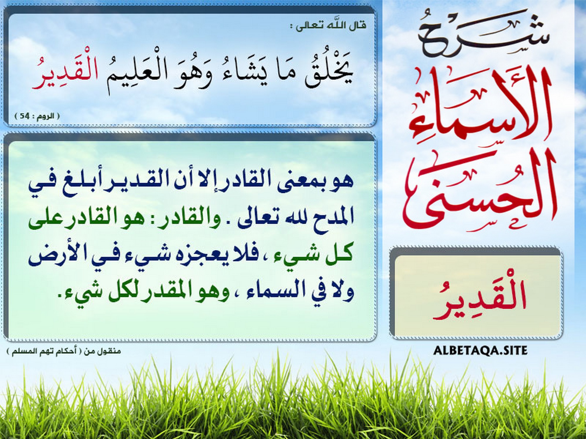 والقادر: هو القادر على كل شيء، فلا يعجزه شيء في الأرض ولا في السماء، وهو المقدر لكل شيء. منقول من (أحكام تهم المسلم)