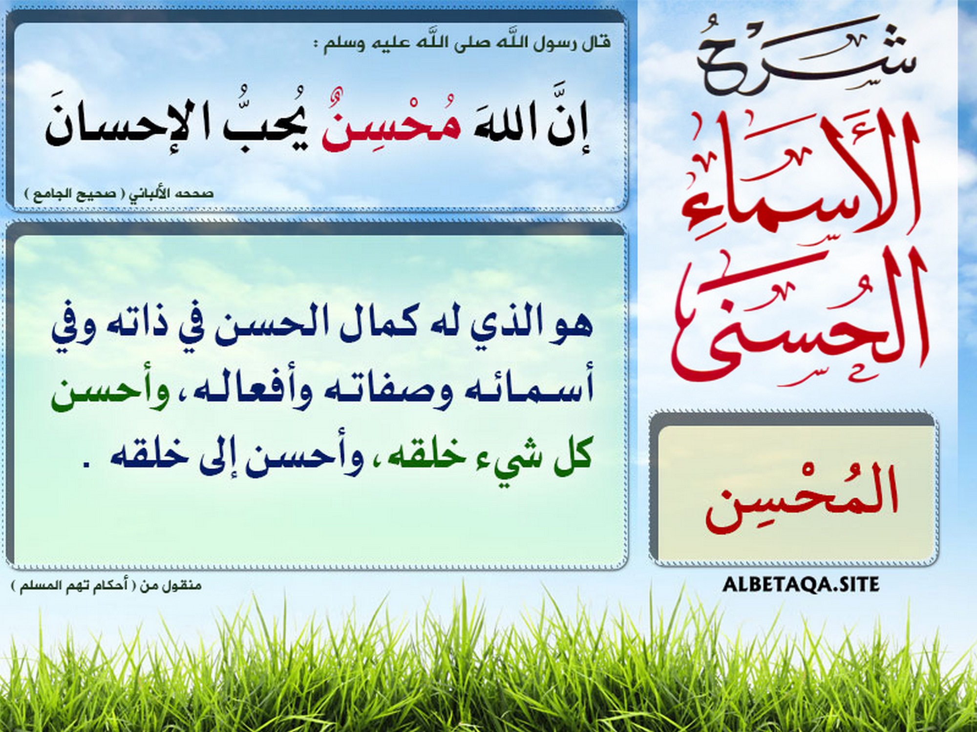 المحسن: هو الذي له كمال الحسن في ذاته وفي أسمائه وصفاته وأفعاله، وأحسن كل شيء خلقه، وأحسن إلى خلقه. منقول من (أحكام تهم المسلم)