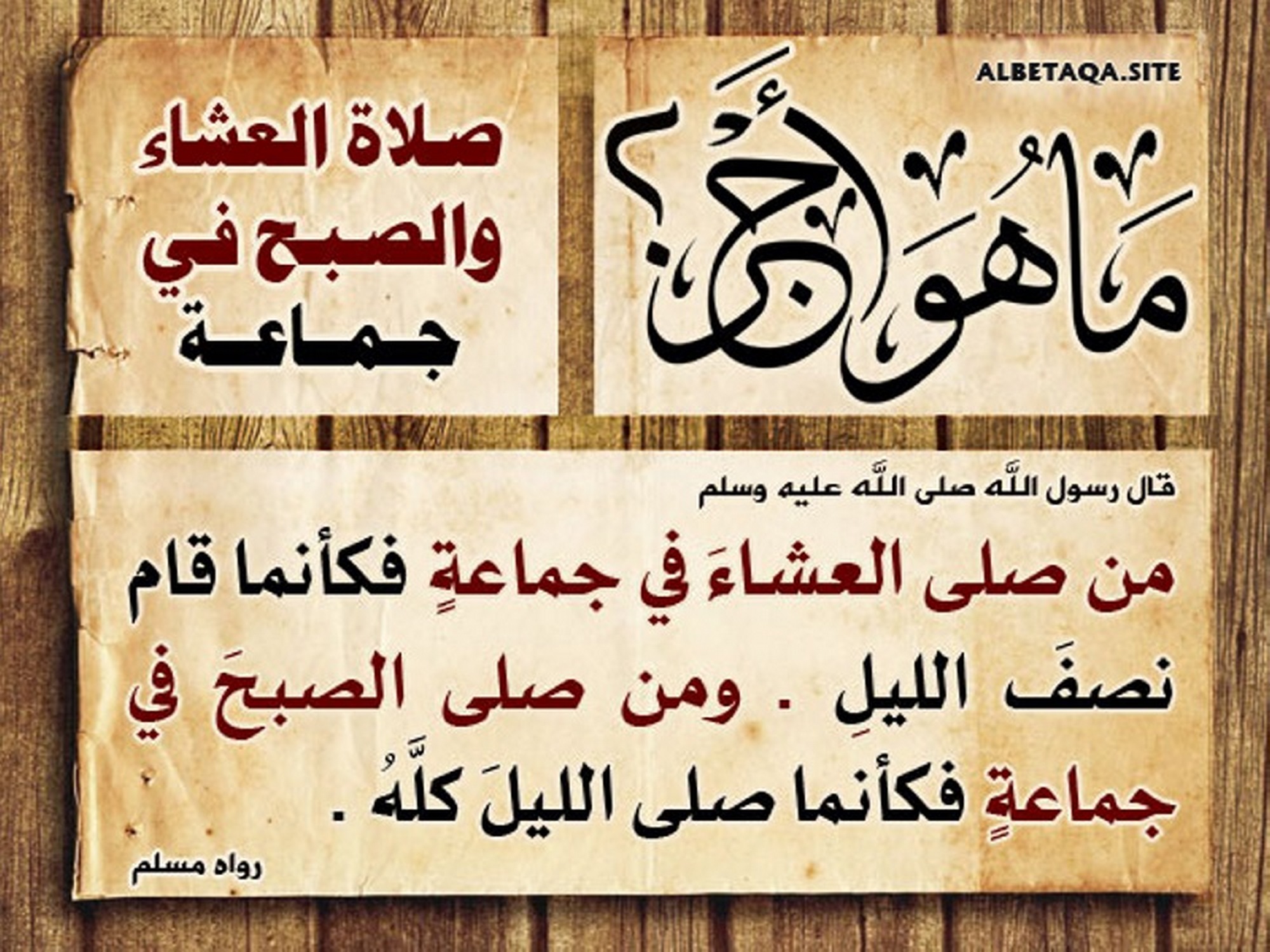 (من صلى العشاء في جماعة فكأنما قام نصف الليل. ومن صلى الصبح في جماعة فكأنما صلى الليل كله). رواه مسلم