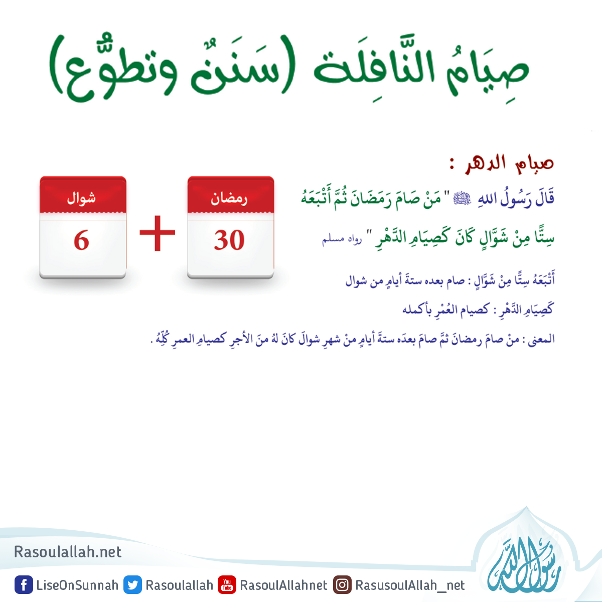 (( مَن صامَ رَمَضانَ ثُمَّ أتْبَعَهُ سِتًّا مِن شَوَّالٍ، كانَ كَصِيامِ الدَّهْرِ ))