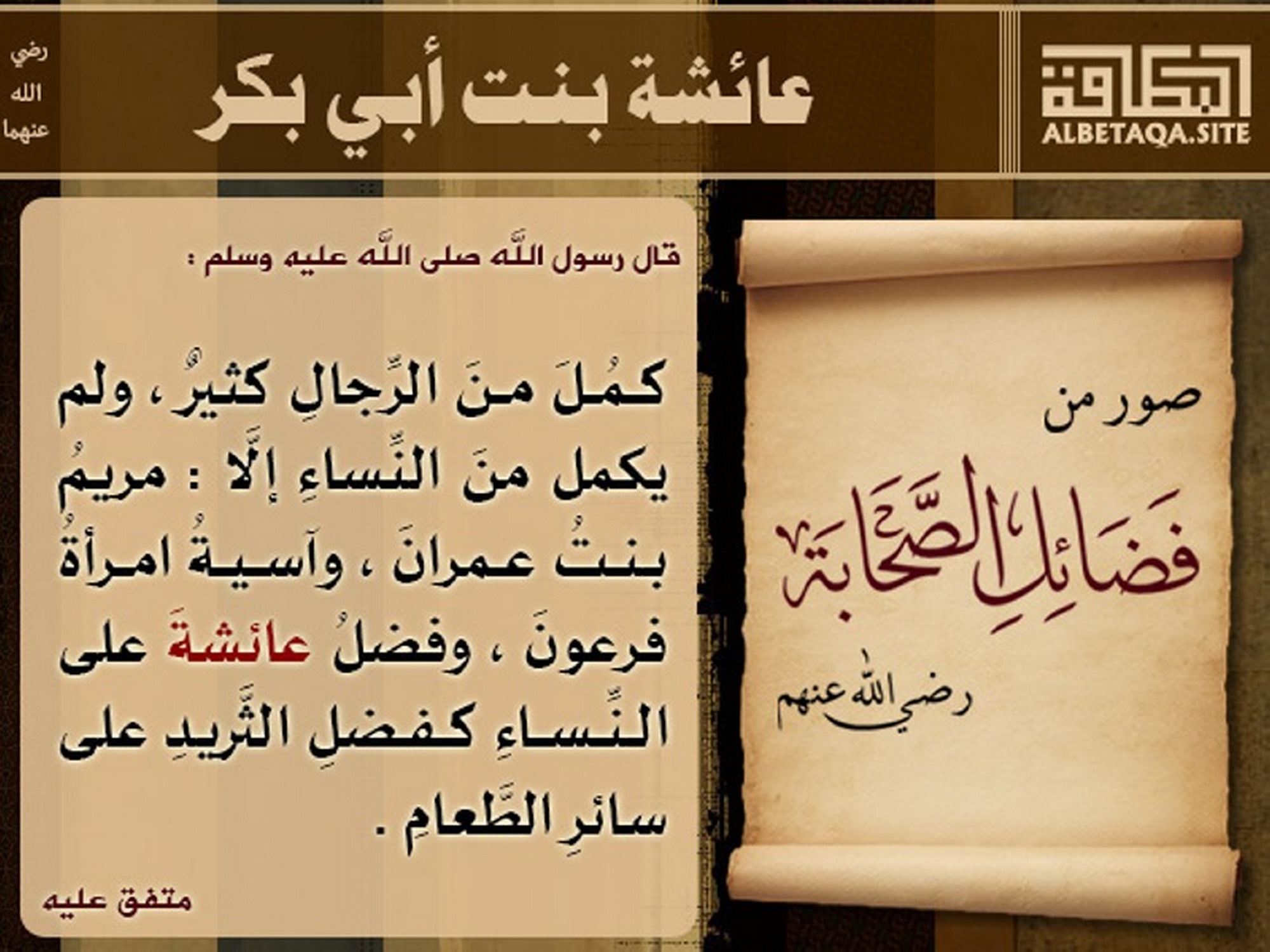 (كمل من الرجال كثير، ولم يكمل من النساء إلا: مريم بنت عمران، وآسية امرأة فرعون، وفضل عائشة على النساء كفضل الثريد على سائر الطعام). متفق عليه