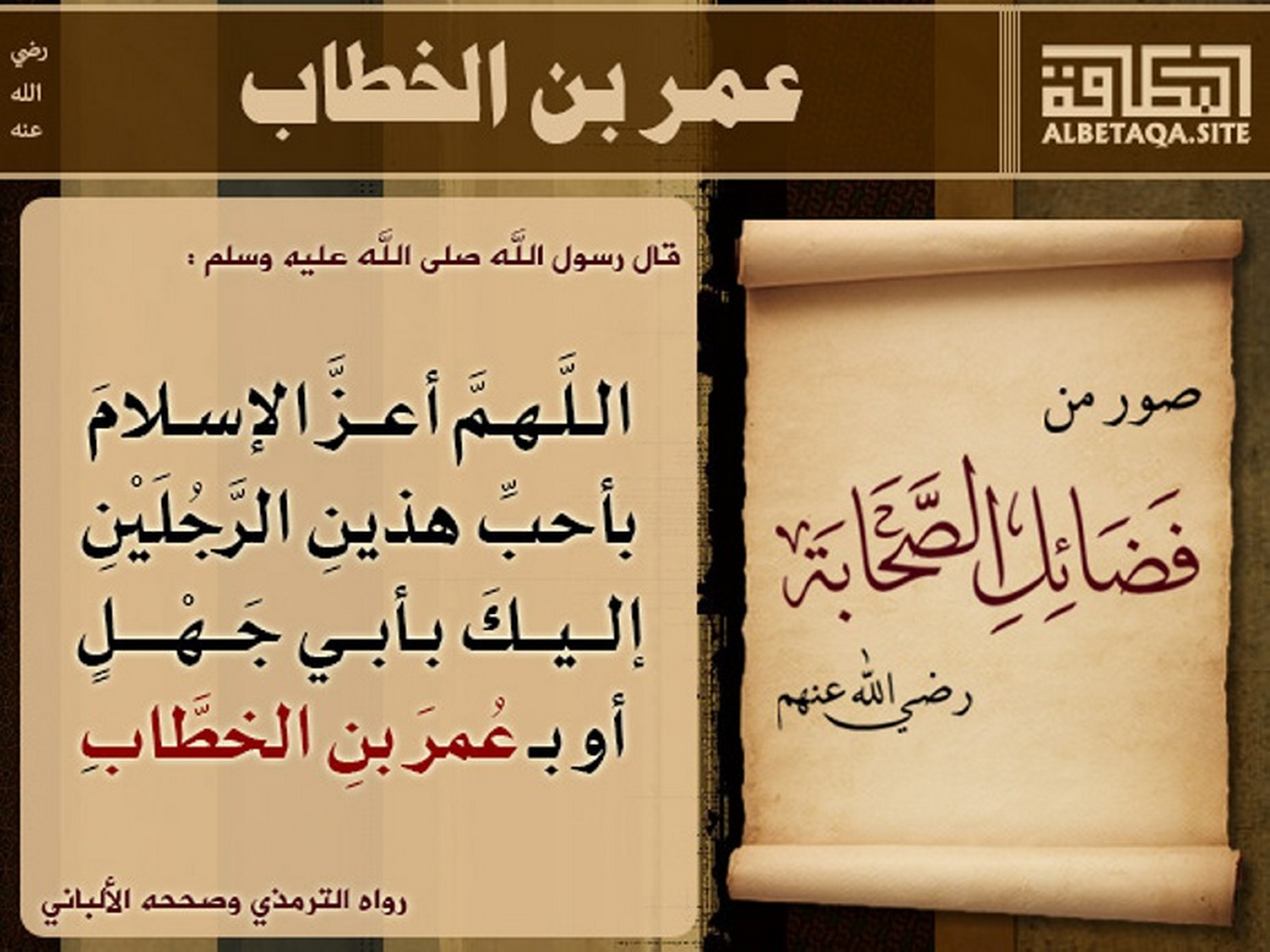 (اللهم أعز الإسلام بأحب هذين الرجلين إليك بأبي جهل أو بعمر بن الخطاب). رواه الترمذي وصححه الألباني