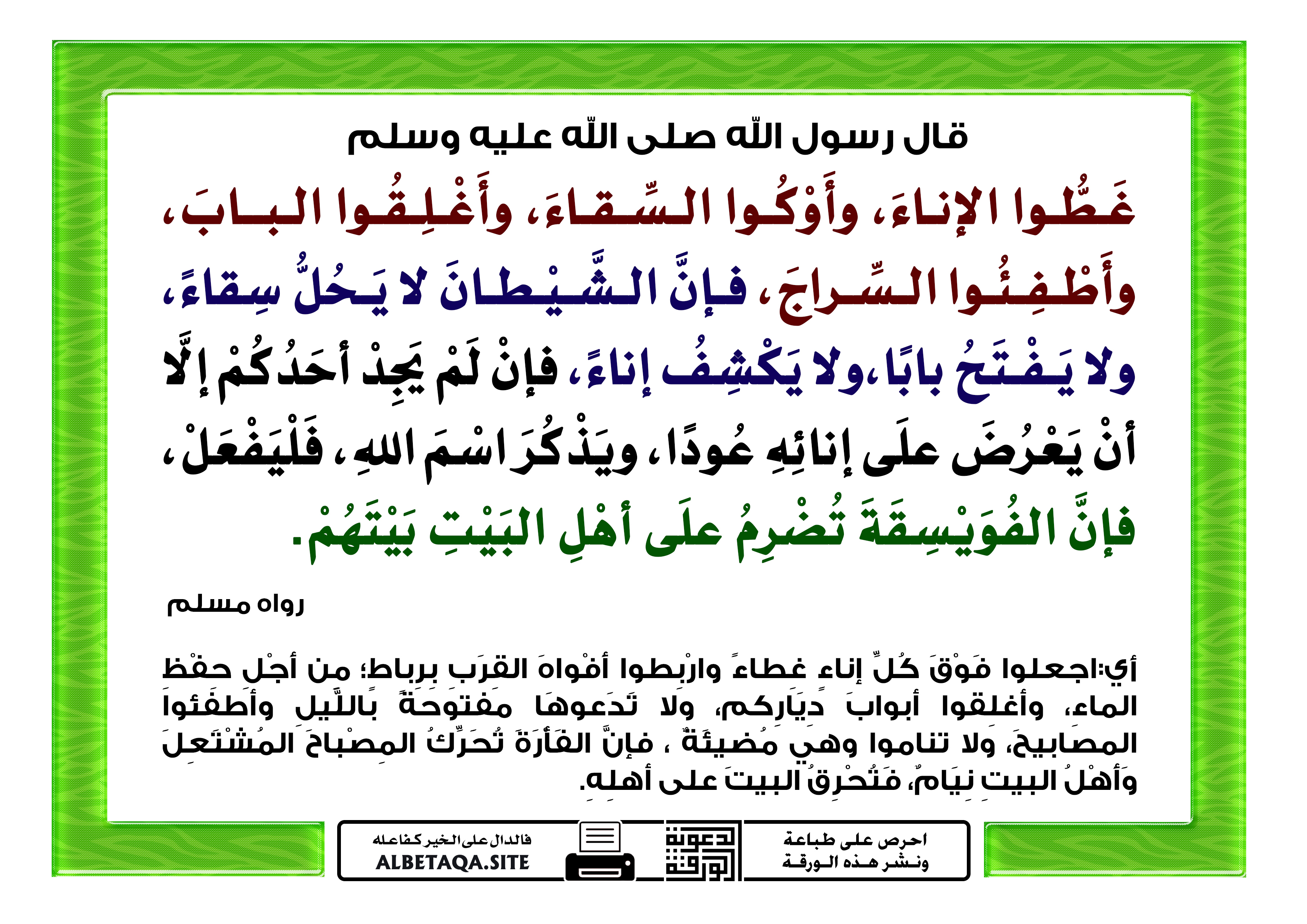 (غطوا الإناء، وأوكوا السقاء، وأغلقوا الباب، وأطفئوا السراج، فإن الشيطان لا يحل سقاء، ولا يفتح بابا، ولا يكشف إناء،فإن لم يجد أحدكم إلا أن يعرض على إنائه عودا، ويذكر اسم الله، فليفعل، فإن الفويسقة تضرم على أهل البيت بيتهم). رواه مسلم