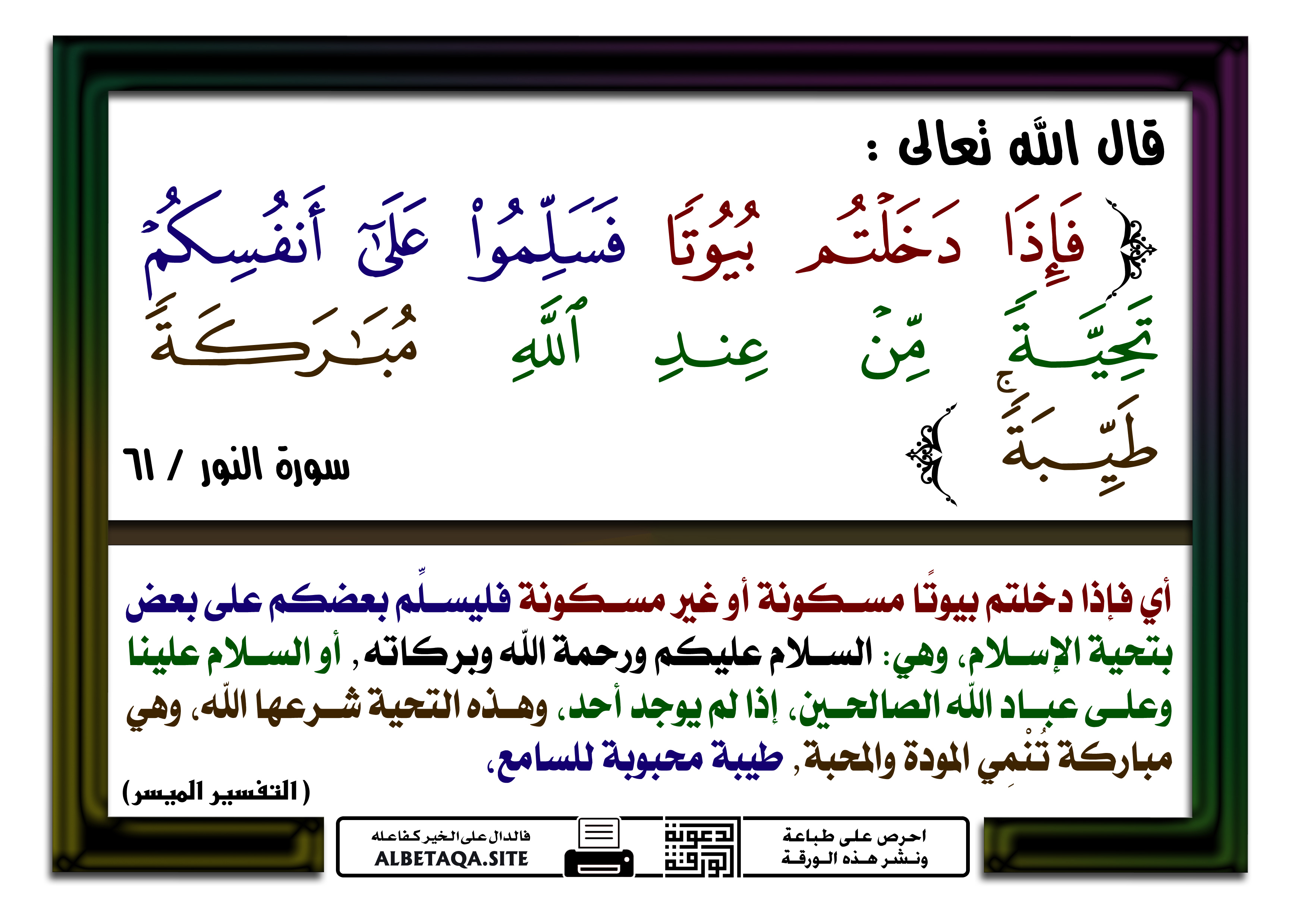 ”فإذا دخلتم بيوتا فسلموا على أنفسكم تحية من عند الله مباركة طيبة”