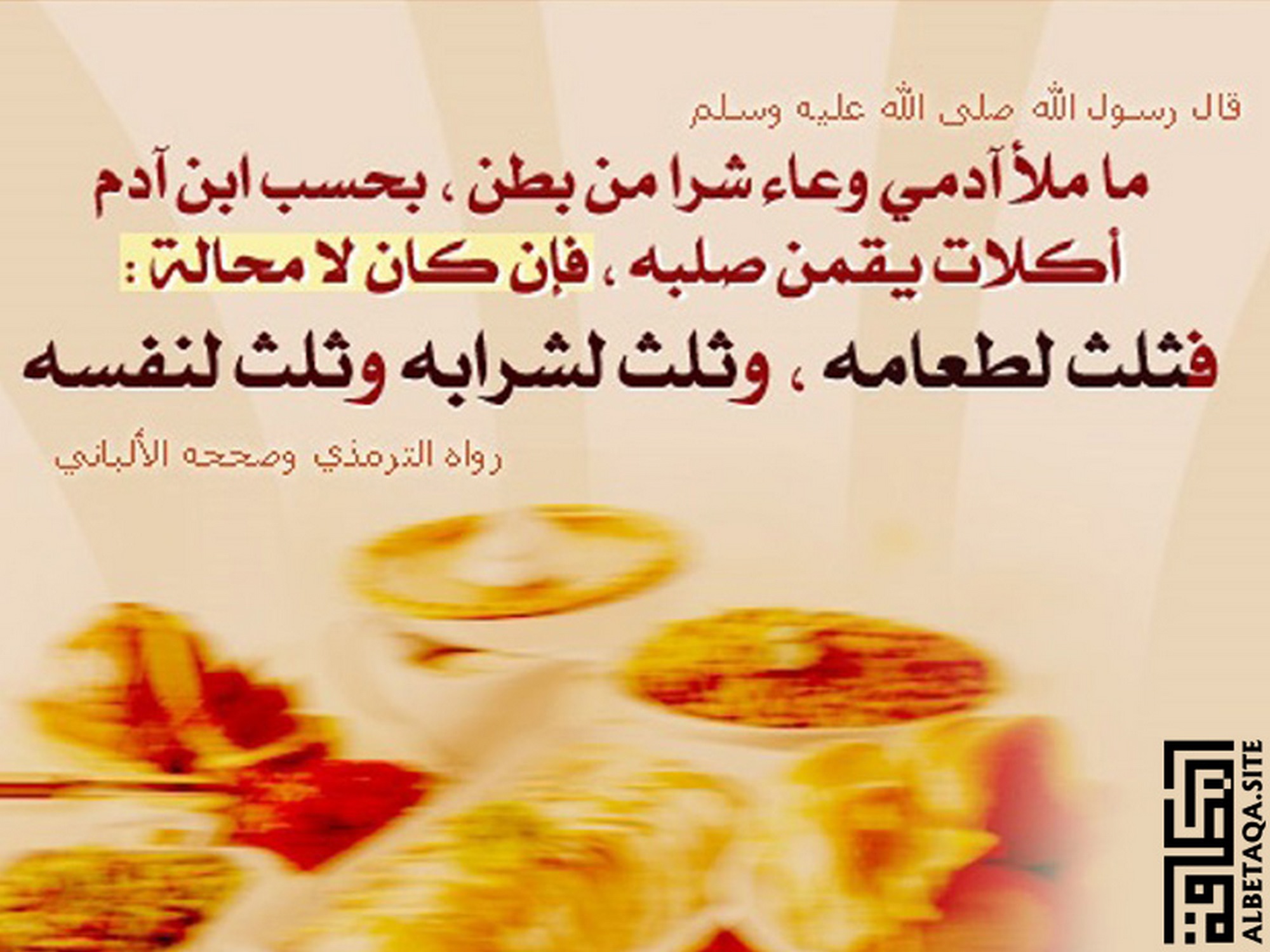 (ما ملأ آدمي وعاء شرا من بطنه بحسب ابن آدم أكلات يقمن صلبه فإن كان لا محالة فثلث لطعامه وثلث لشرابه وثلث لنفس). صححه الألباني