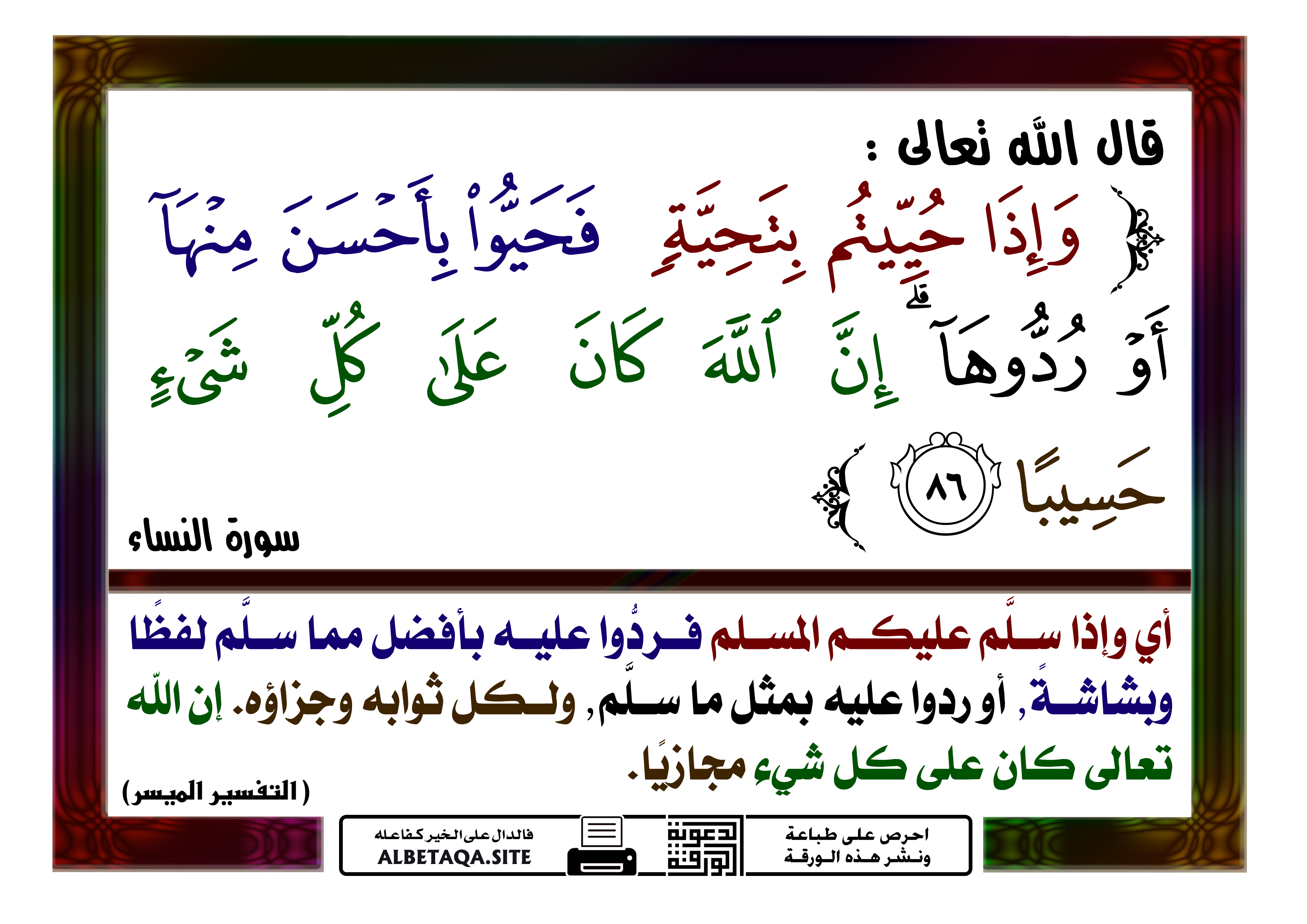 (وإذا حييتم بتحية فحيوا بأحسن منها أو ردوها إن الله كان على كل شيء حسيبا). (النساء : 86)