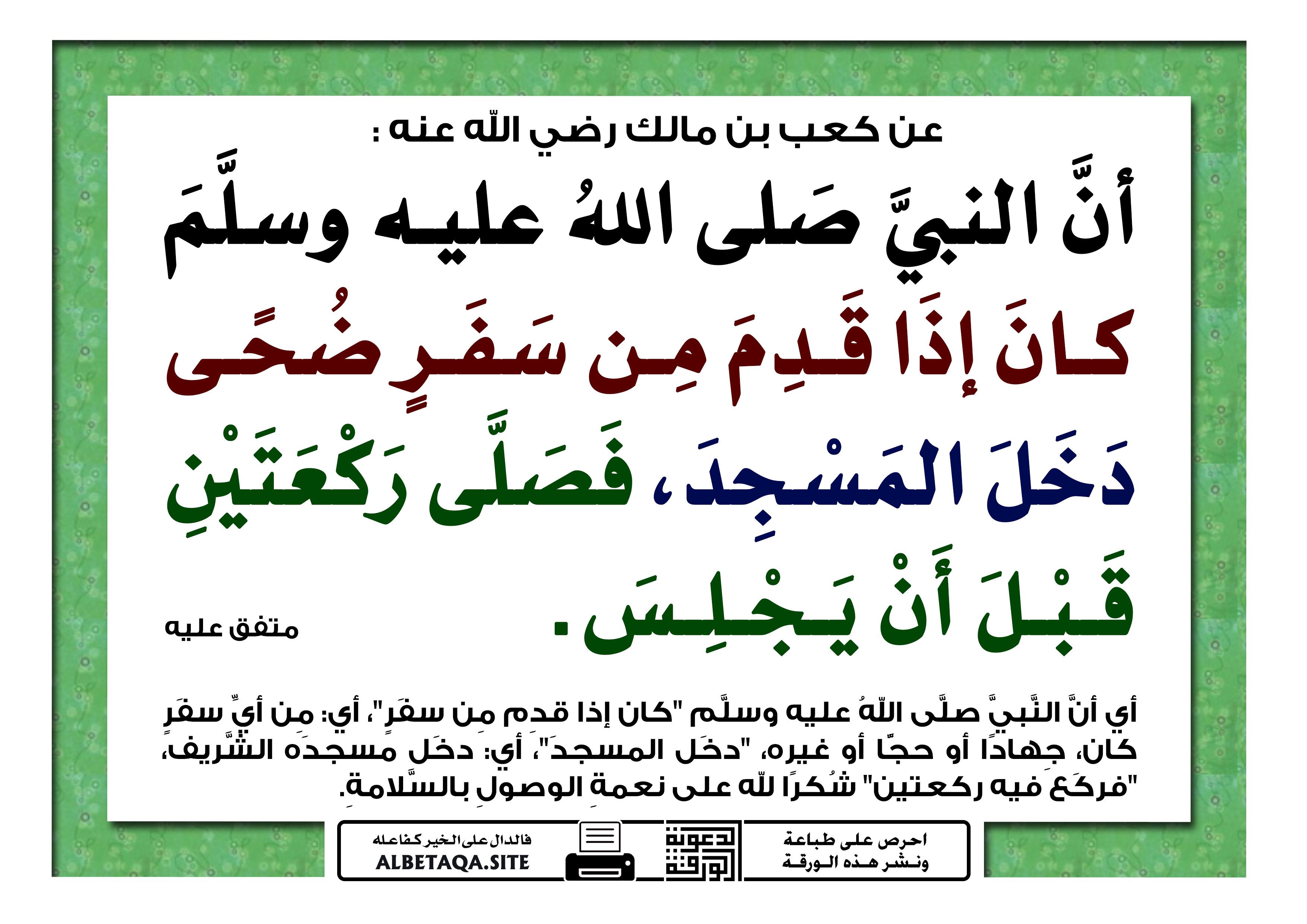أي أن النبي صلى الله عليه وسلم “كان إذا قدم من سفر”، أي: من أي سفر كان، جهادا أو حجا أو غيره، “دخل المسجد”، أي: دخل مسجده الشريف، “فركع فيه ركعتين” شكرا لله على نعمة الوصول بالسلامة.