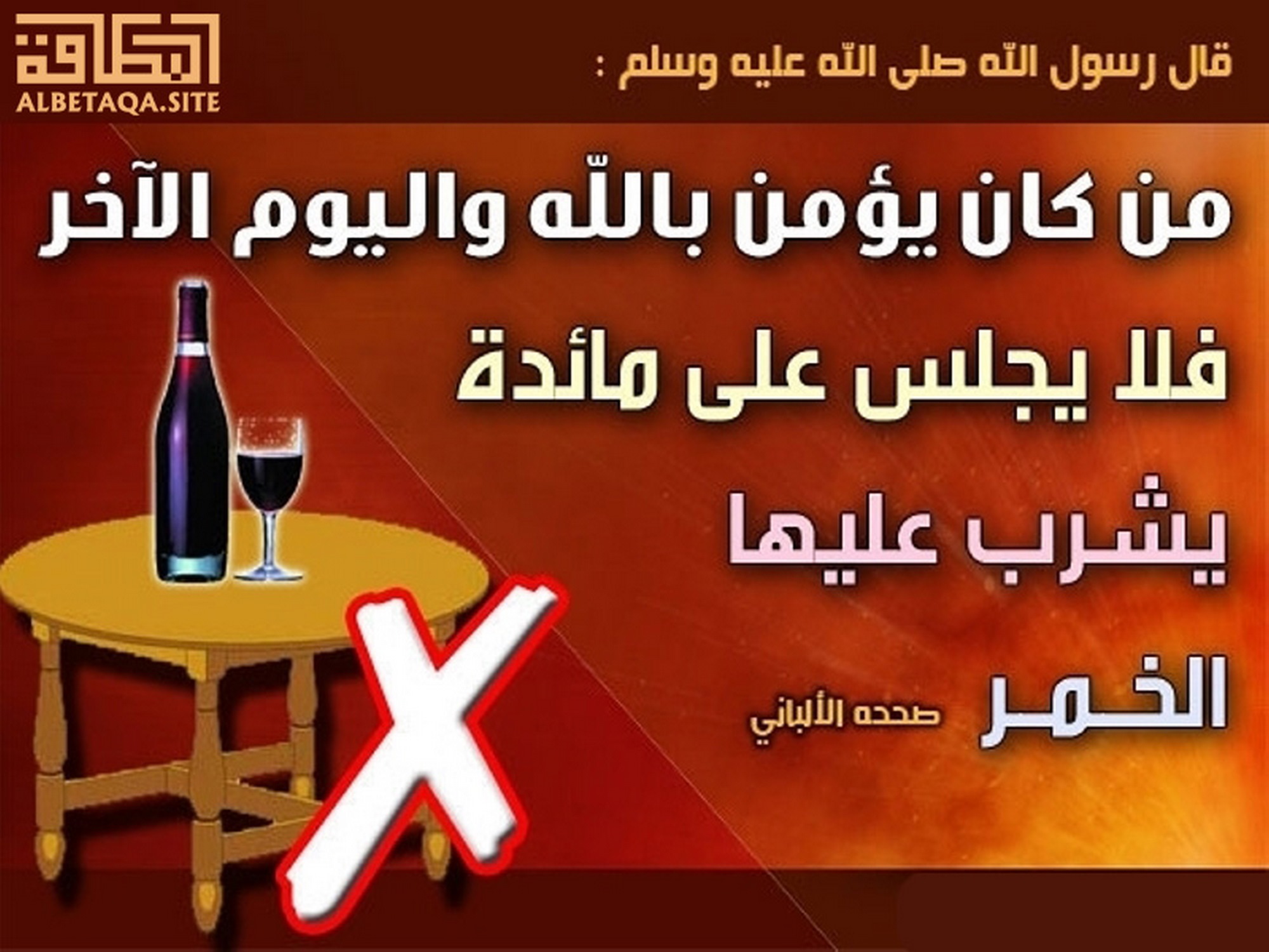 (من كان يؤمن بالله واليوم الآخر فلا يجلس على مائدة يشرب عليها الخمر). صححه الألباني
