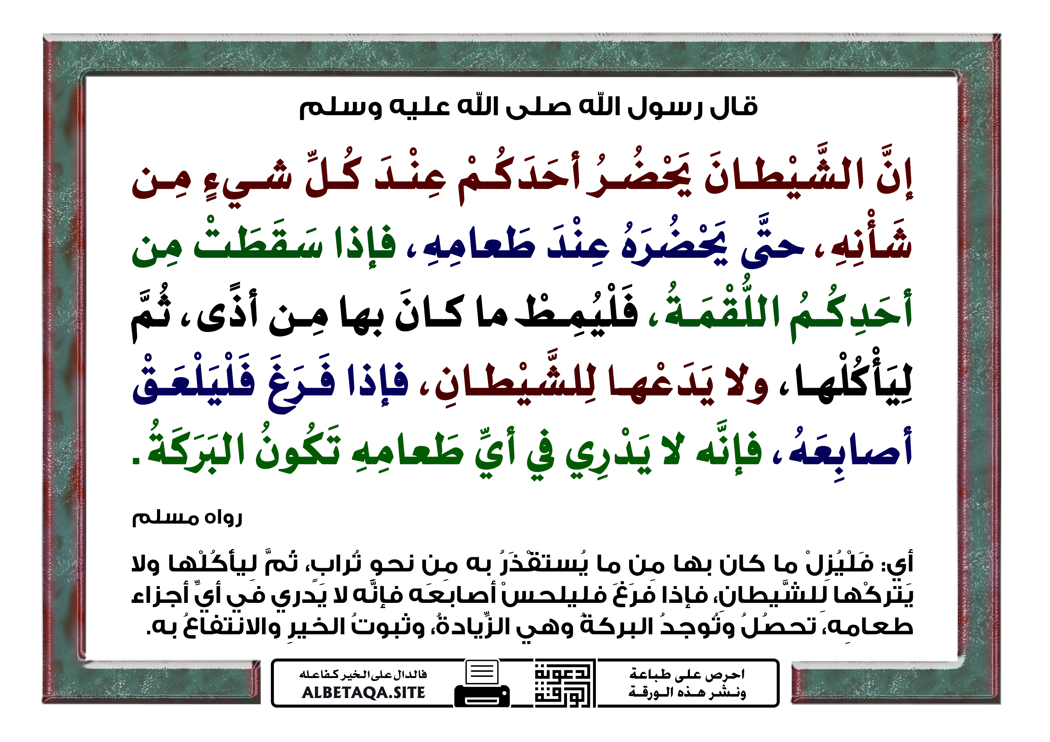 إن الشيطان يحضر أحدكم عند كل شيء من شأنه، حتى يحضره عند طعامه، فإذا سقطت من أحدكم اللقمة، فليمط ما كان بها من أذى، ثم ليأكلها، ولا يدعها للشيطان، فإذا فرغ فليلعق أصابعه، فإنه لا يدري في أي طعامه تكون البركة. رواه مسلم