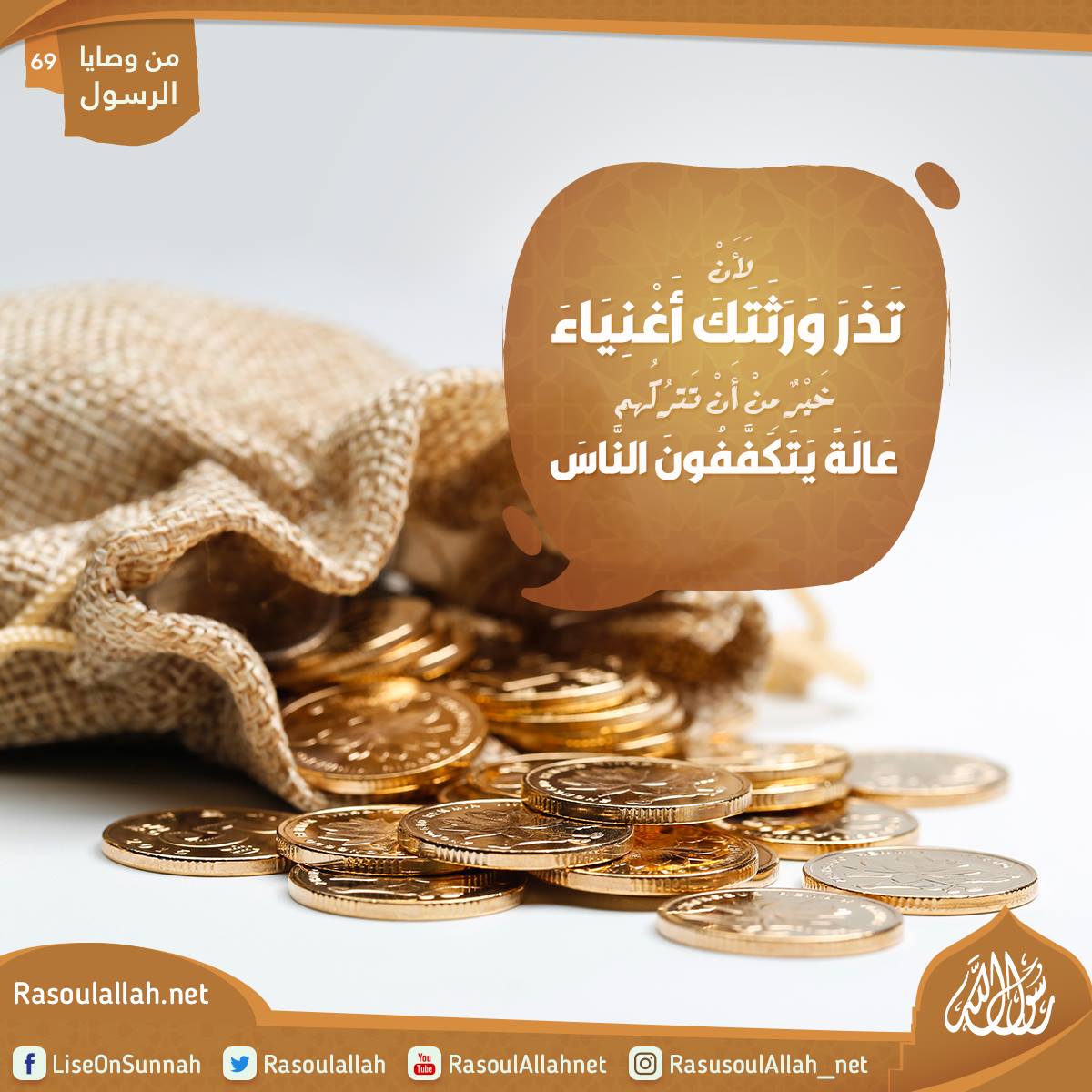 "إِنَّكَ أَنْ تَدَعَ وَرَثَتَكَ أَغْنِيَاءَ خَيْرٌ مِنْ أَنْ تَدَعَهُمْ عَالَةً يَتَكَفَّفُونَ النَّاسَ فِي أَيْدِيهِمْ".
