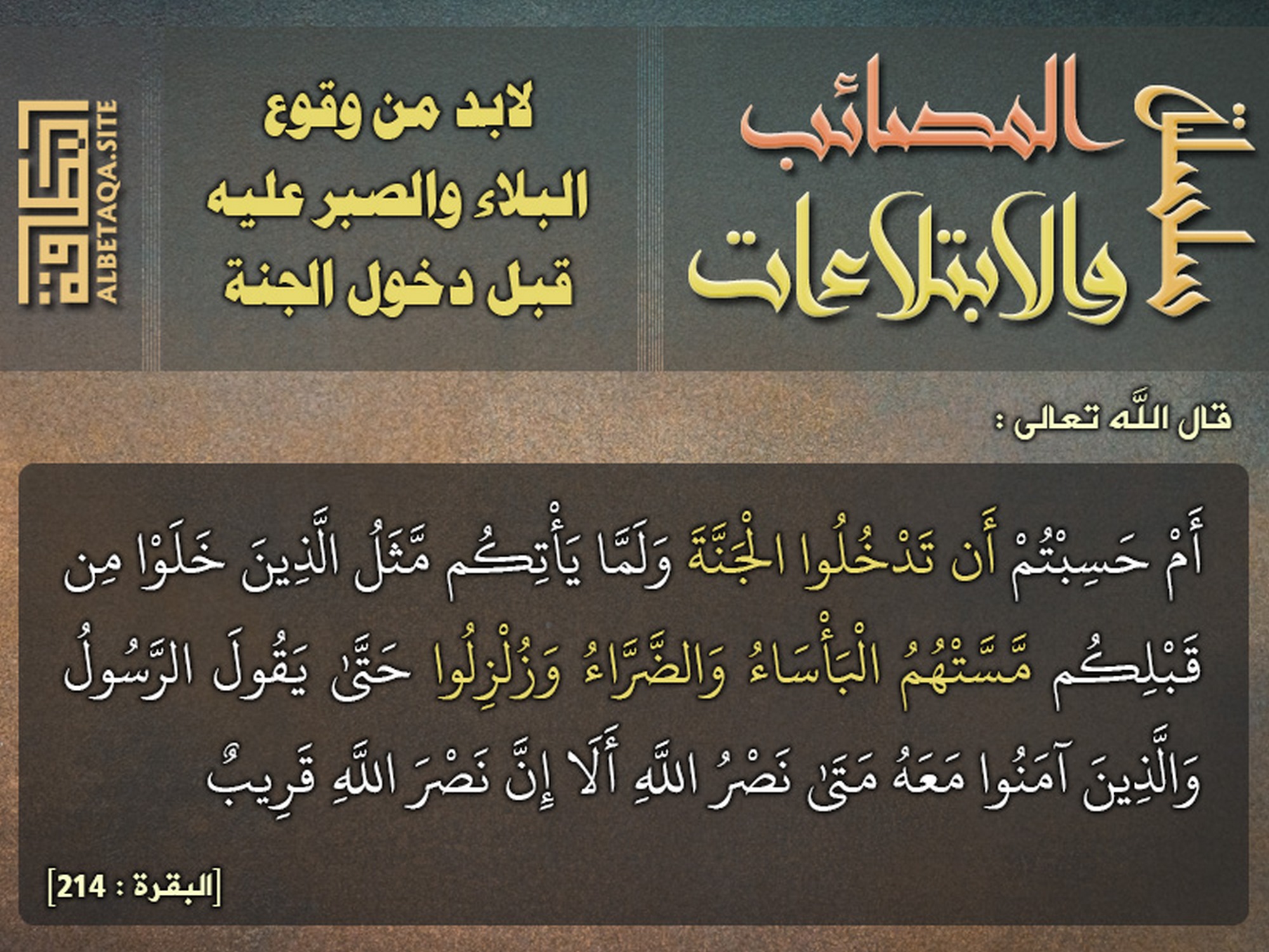 (أم حسبتم أن تدخلوا الجنة ولما يأتكم مثل الذين خلوا من قبلكم مستهم البأساء والضراء وزلزلوا حتى يقول الرسول والذين آمنوا معه متى نصر الله ألا إن نصر الله قريب). [البقرة: 214]