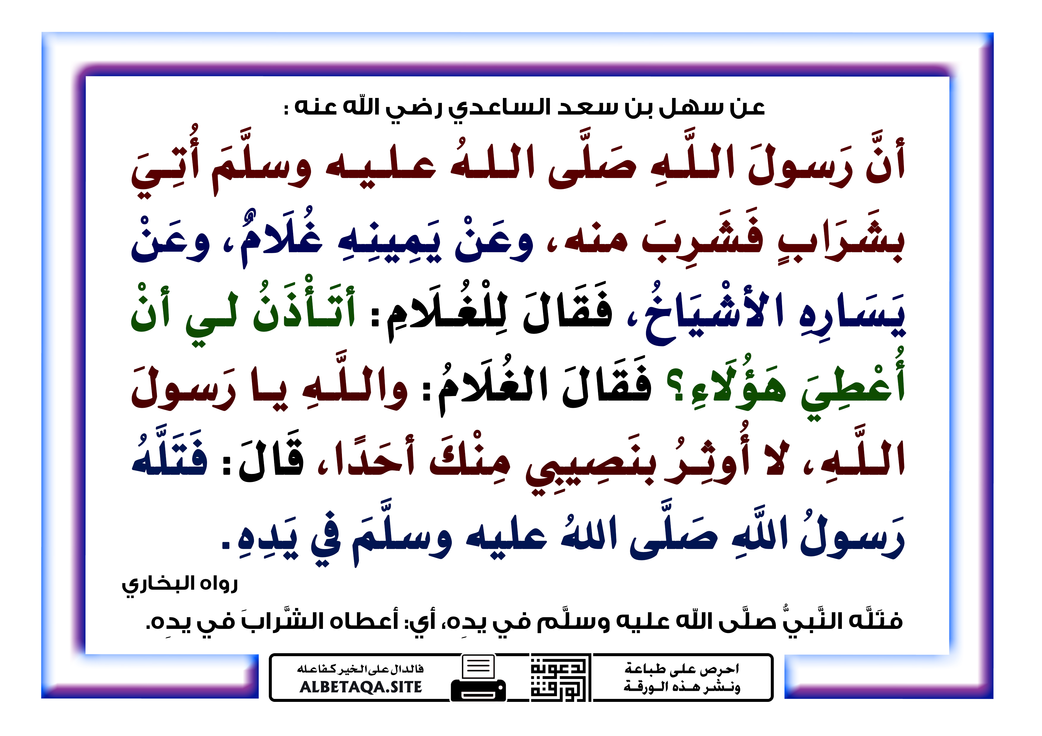 (أن رسول الله صلى الله عليه وسلم أتي بشراب فشرب منه، وعن يمينه غلام، وعن يساره الأشياخ، فقال للغلام: أتأذن لي أن أعطي هؤلاء؟ فقال الغلام: والله يا رسول الله، لا أوثر بنصيبي منك أحدا، قال: فتله رسول الله صلى الله عليه وسلم في يده). رواه البخاري