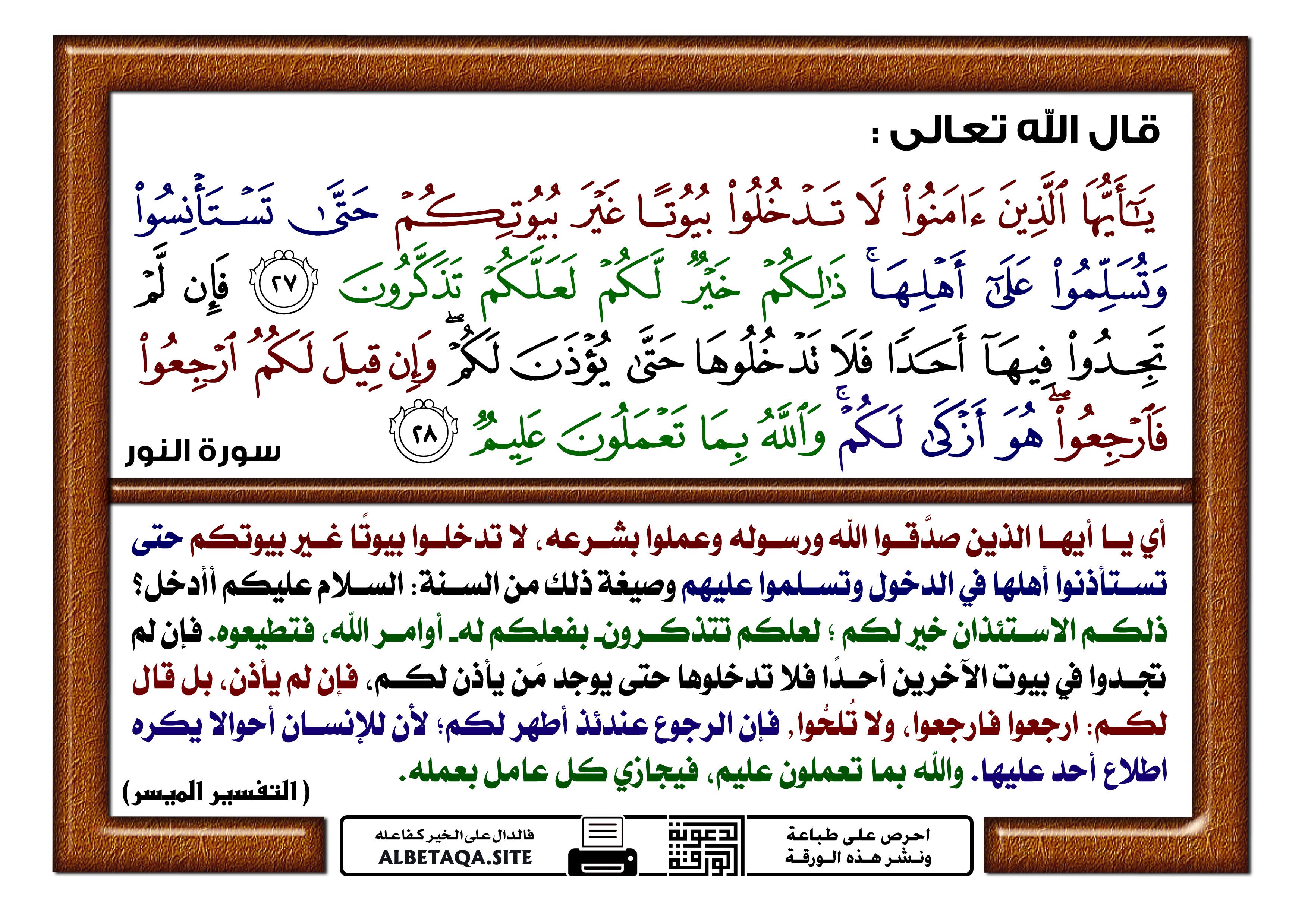 (”يا أيها الذين آمنوا لا تدخلوا بيوتا غير بيوتكم حتى تستأنسوا وتسلموا على أهلها ذلكم خير لكم لعلكم تذكرون * فإن لم تجدوا فيها أحدا فلا تدخلوها حتى يؤذن لكم وإن قيل لكم ارجعوا فارجعوا هو أزكى لكم والله بما تعملون عليم”). [النور : 27_28]