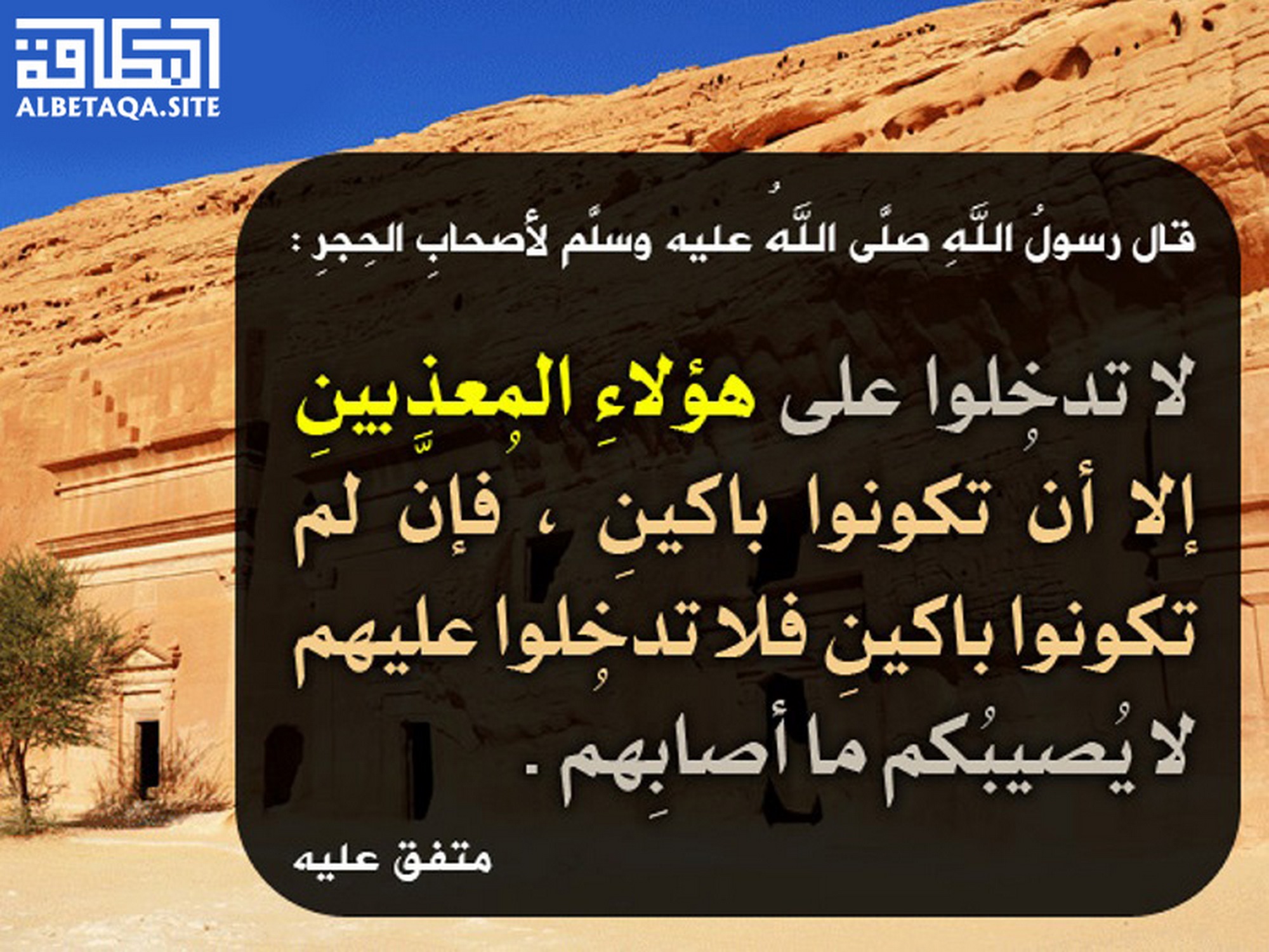 (لا تدخلوا على هؤلاء المعذبين إلا أن تكونوا باكين، فإن لم تكونوا باكين فلا تدخلوا عليهم، لا يصيبكم ما أصابهم). متفق عليه
