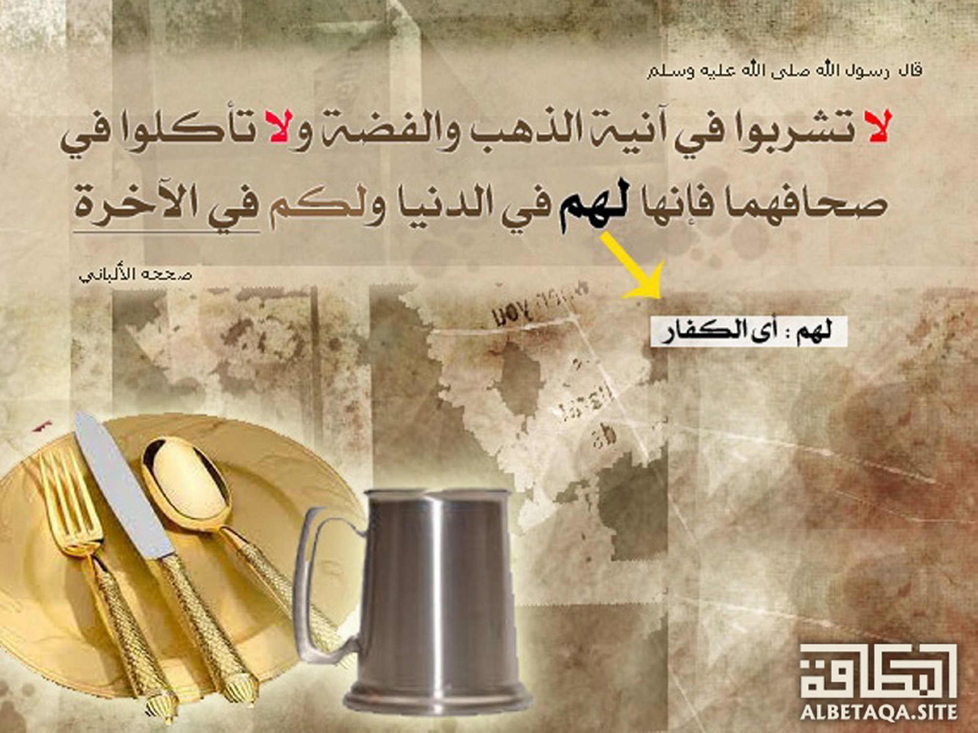 (لا تشربوا في آنية الذهب والفضة ولا تأكلوا في صحافهما فإنها لهم في الدنيا ولكم في الآخرة). صححه الألباني