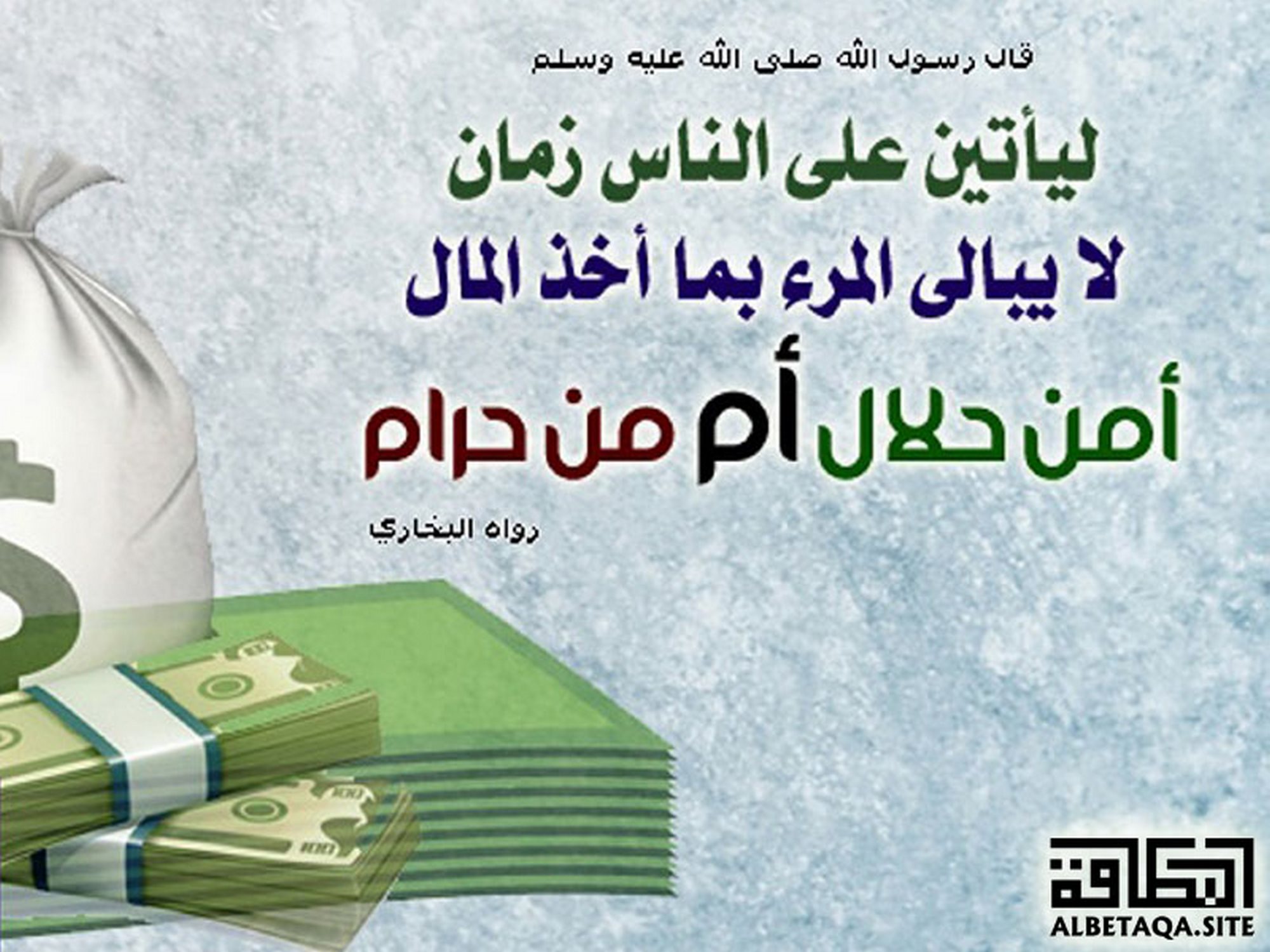 (ليأتين على الناس زمان لا يبالي المرء بما أخذ المال أمن حلال أم من حرام). رواه البخاري