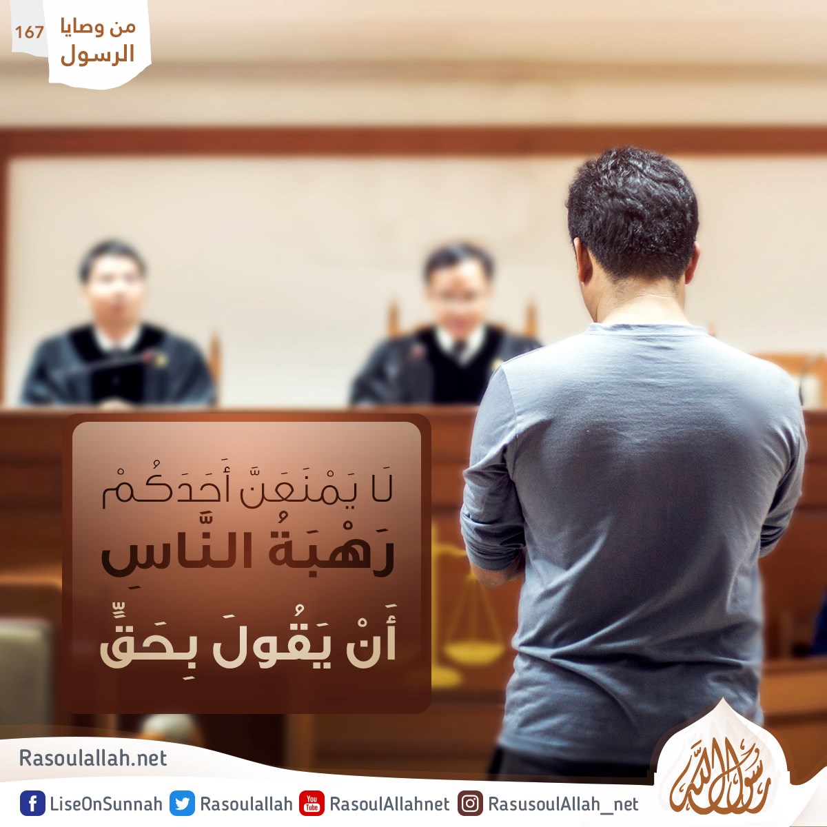 "أَلَا لَا يَمْنَعَنَّ أَحَدَكُمْ رَهْبَةُ النَّاسِ أَنْ يَقُولَ بِحَقٍّ إِذَا رَآهُ أَوْ شَهِدَهُ".