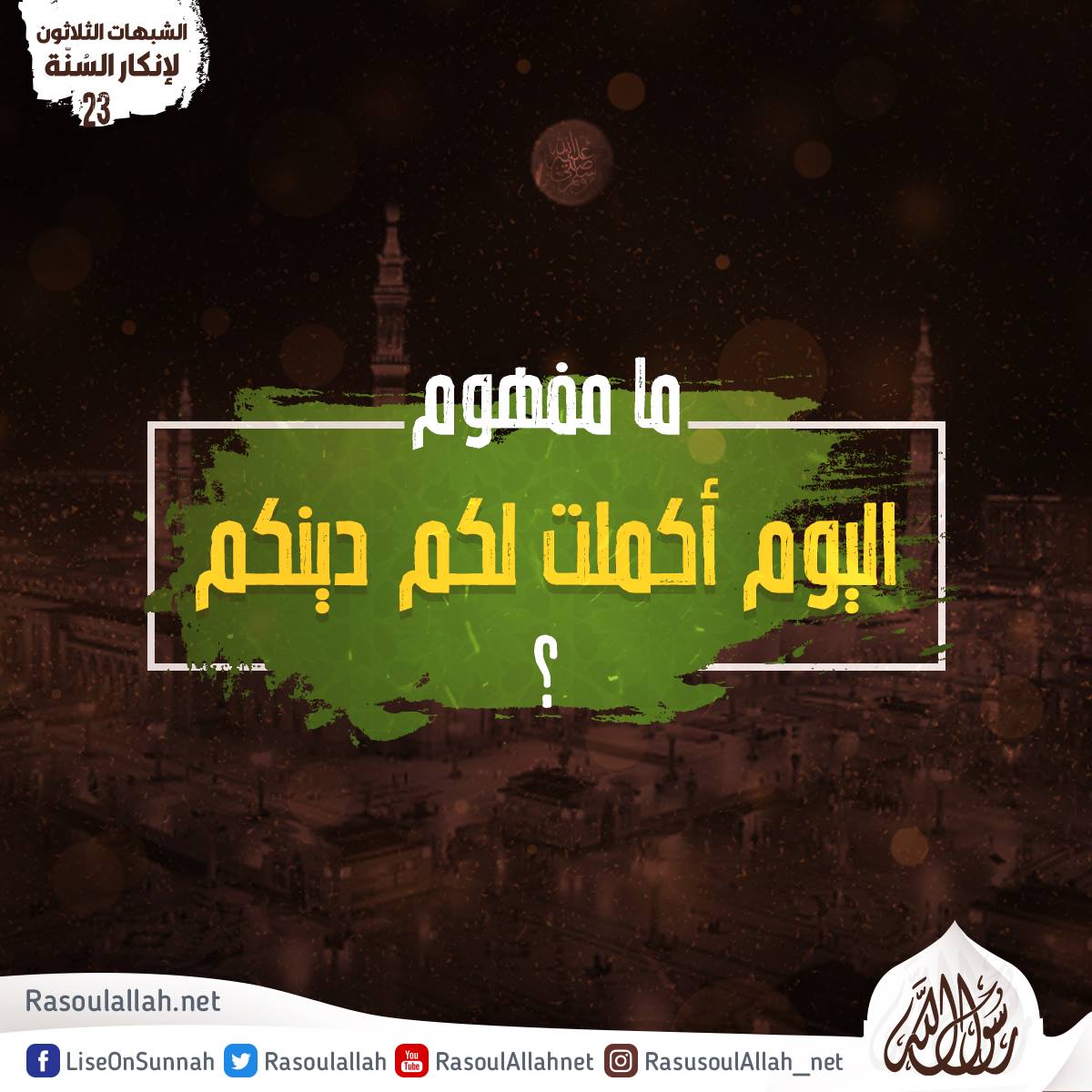 ووجه استدلالهم بهذا الآية على إنكار السُّنَّة وأنها بدعة وزيادة في الدين: إن هذه الآية نزلت في أواخر حياة النبي صلى الله عليه وسلم ولم يكن للسُّنَّة وجود، لأن السُّنَّة جُمِعَت ودونت في القرن الثالث الهجري، فلو كان الدين وكماله متوقفاً عليها ما قال الله تعالى: