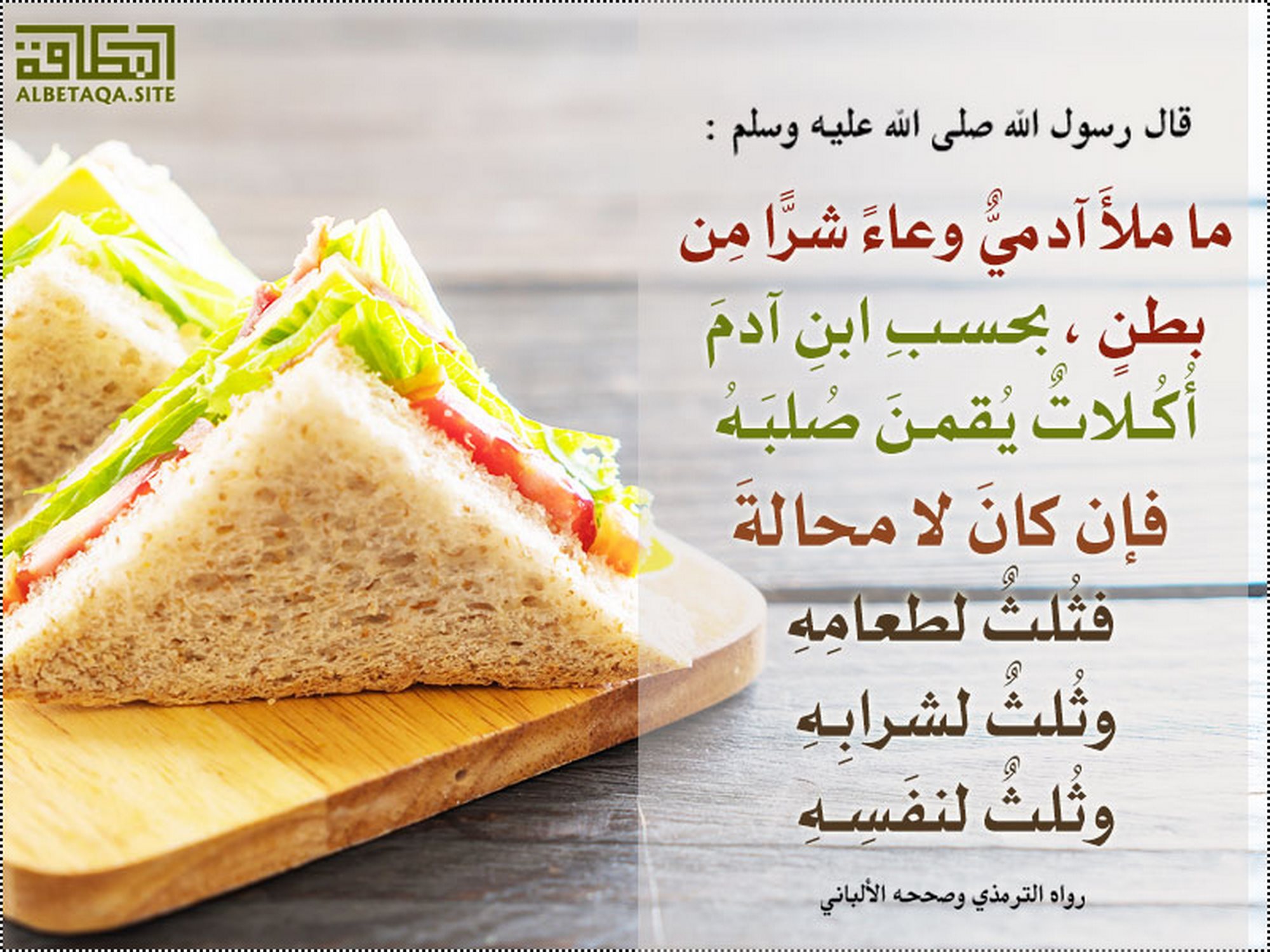(ما ملأ آدمي وعاء شرا من بطن، بحسب ابن آدم أكلات يقمن صلبه، فإن كان لا محالة فثلث لطعامه وثلث لشرابه وثلث لنفسه). رواه الترمذي وصححه الألباني