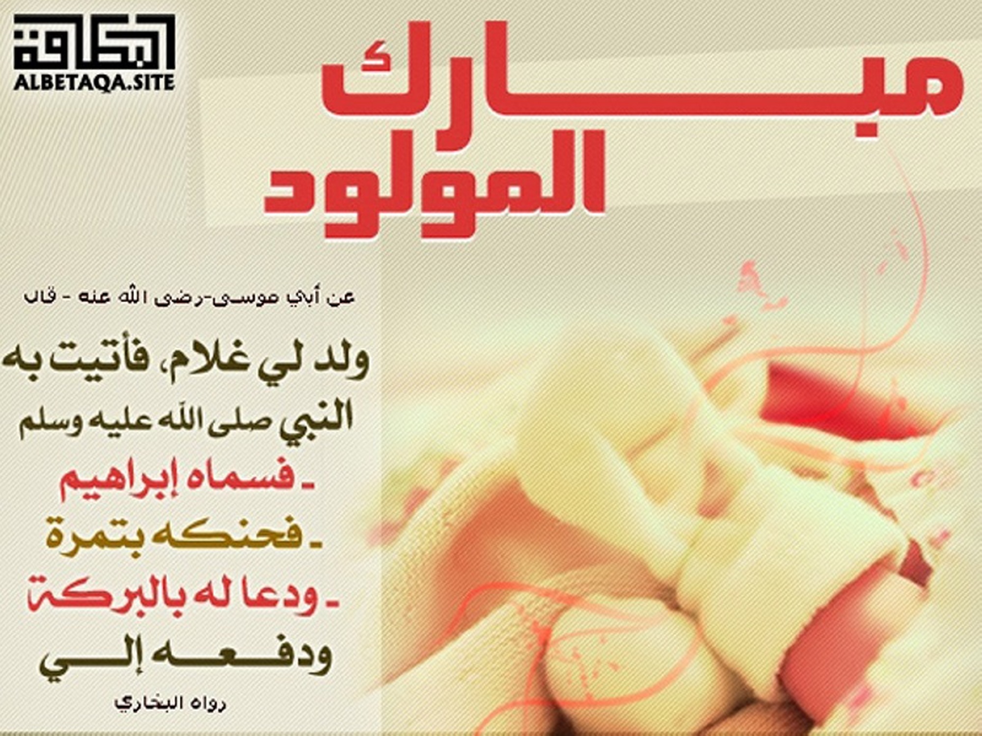 (ولد لي غلام فأتيت النبي صلى الله عليه وسلم. فسماه إبراهيم. فحنكه بتمره. ودعا له بالبركه ودفعه إلي). رواه البخاري