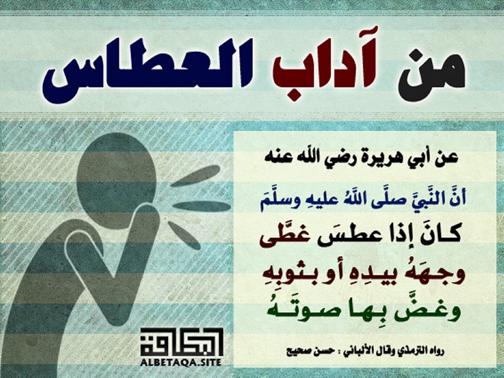 (أن النبي صلى الله عليه وسلم كان إذا عطس غطى وجهه بيده أو بثوبه وغض بها صوته). رواه الترمذي وقال الألباني: حسن صحيح