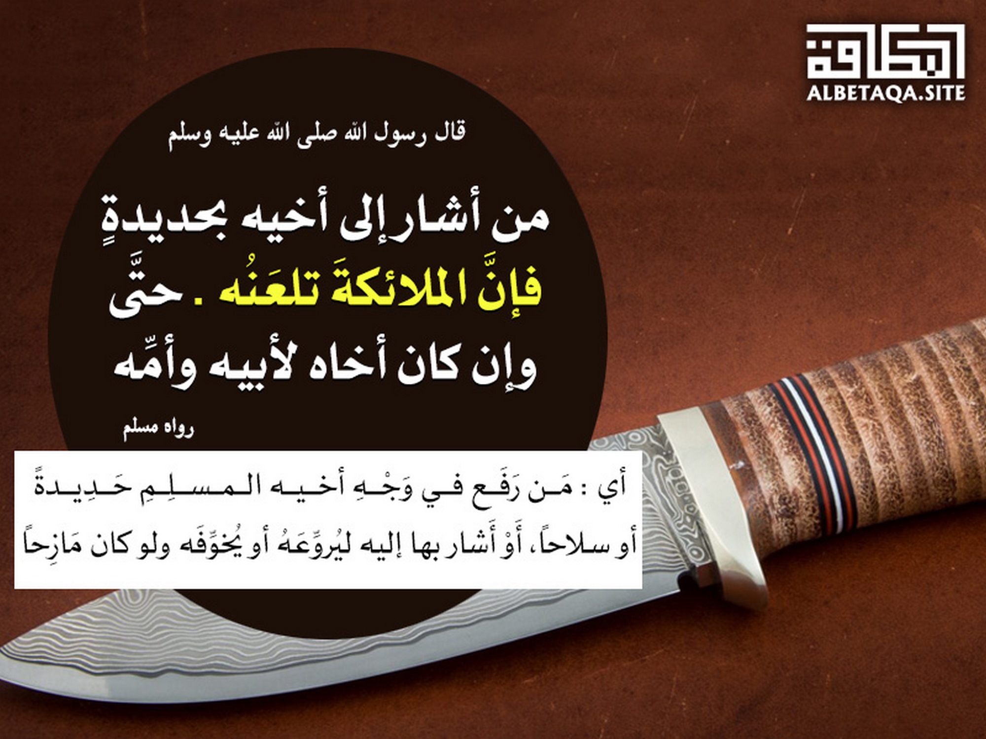 (من أشار إلى أخيه بحديدة فإن الملائكة تلعنه. حتى وإن كان أخاه لأبيه وأمه). رواه مسلم