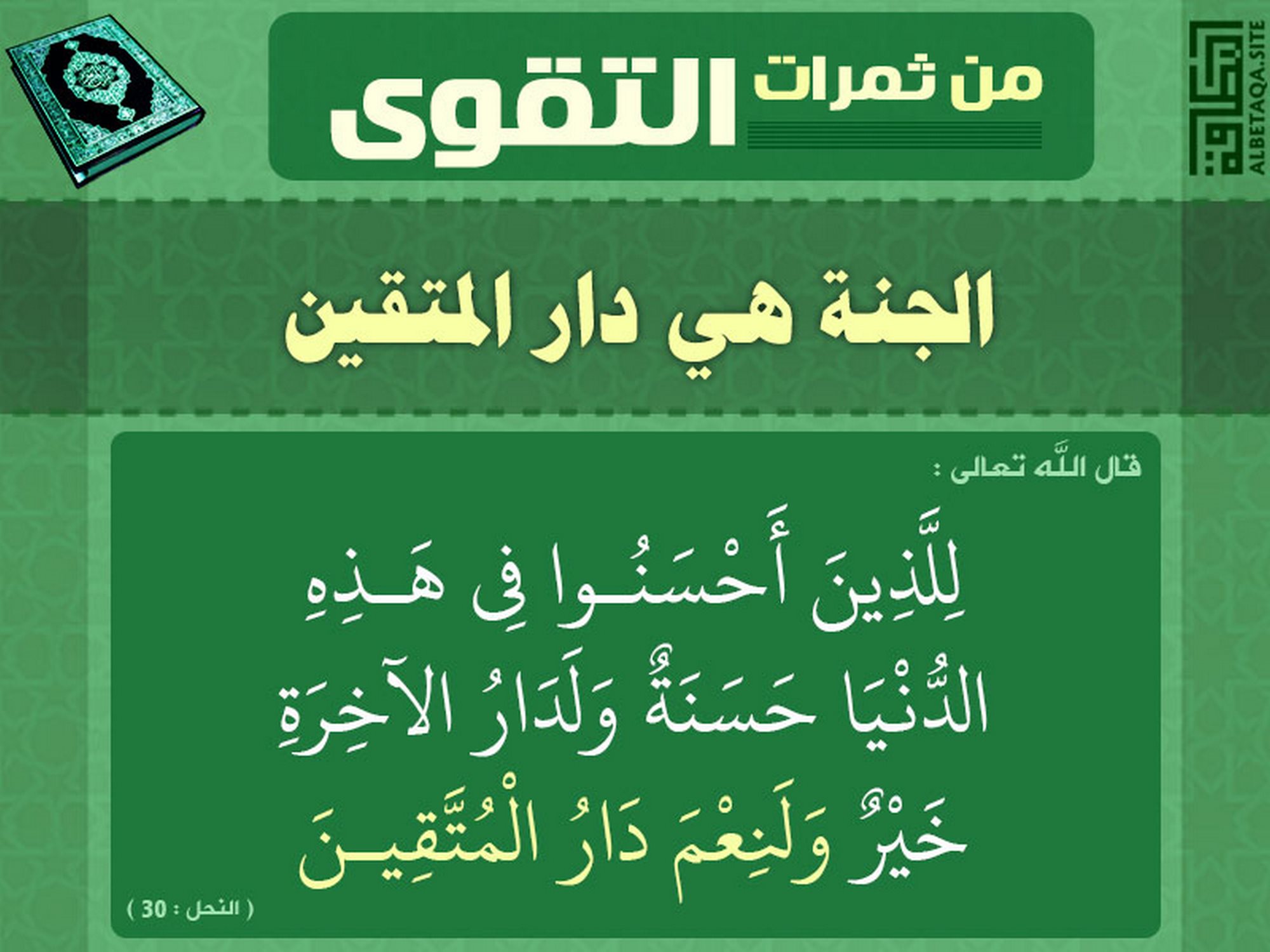 (للذين أحسنوا في هذه الدنيا حسنة ولدار الآخرة خير ولنعم دار المتقين). (النحل: 30)