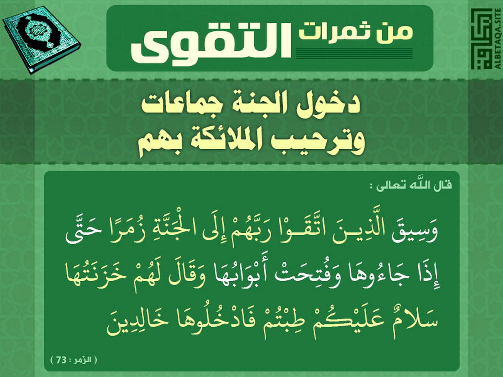 (وسيق الذين اتقوا ربهم إلى الجنة زمرا حتى إذا جاءوها وفتحت أبوابها وقال لهم خزنتها سلام عليكم طبتم فادخلوها خالدين) .(الزمر : 73)