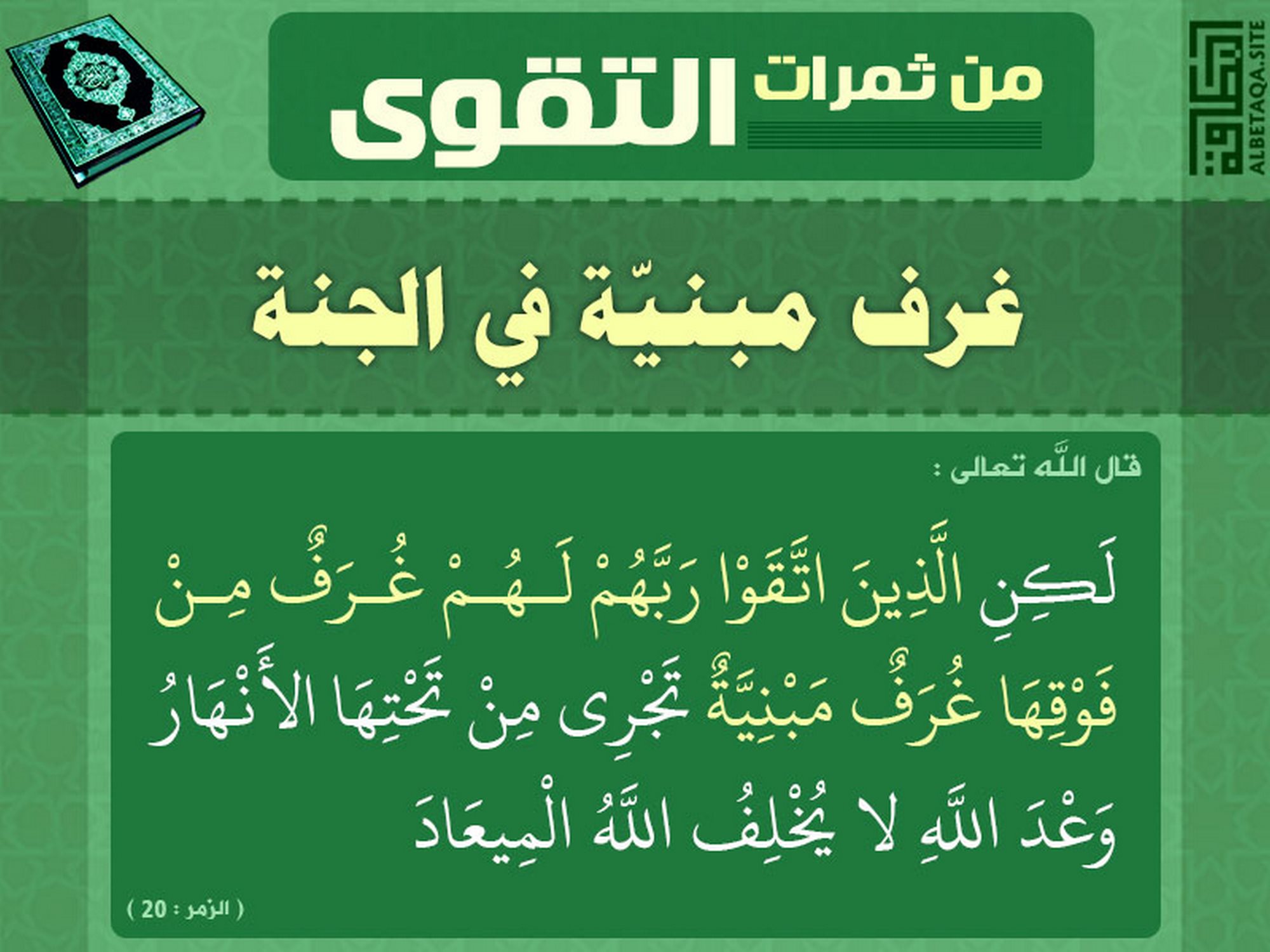(لكن الذين اتقوا ربهم لهم غرف من فوقها غرف مبنية تجري من تحتها الأنهار وعد الله لا يخلف الله الميعاد). (الزمر : 20)
