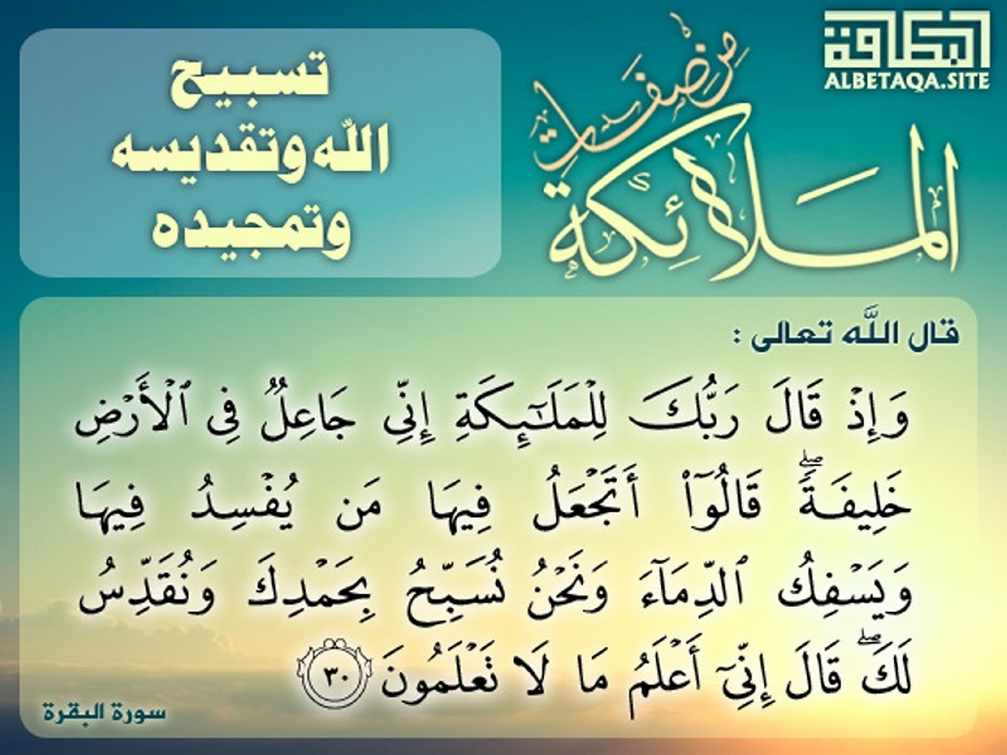 ”وإذ قال ربك للملائكة إني جاعل في الأرض خليفة قالوا أتجعل فيها من يفسد فيها ويسفك الدماء ونحن نسبح بحمدك ونقدس لك قال إني أعلم ما لا تعلمون”. [البقرة : 30]