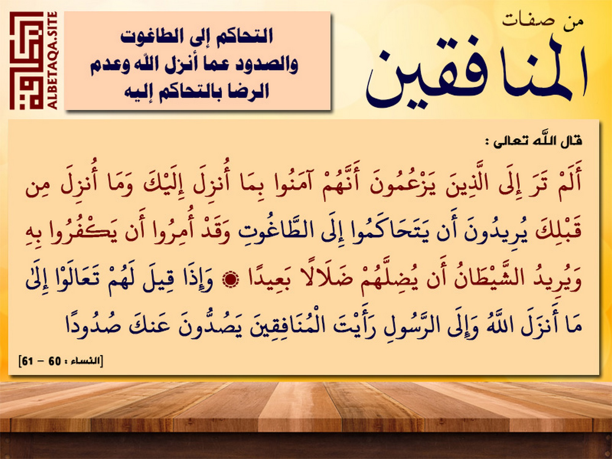 (ألم تر إلى الذين يزعمون أنهم آمنوا بما أنزل إليك وما أنزل من قبلك يريدون أن يتحاكموا إلى الطاغوت وقد أمروا أن يكفروا به ويريد الشيطان أن يضلهم ضلالا بعيدا، وإذا قيل لهم تعالوا إلى ما أنزل الله وإلى الرسول رأيت المنافقين يصدون عنك صدودا). [النساء: 60 – 61]