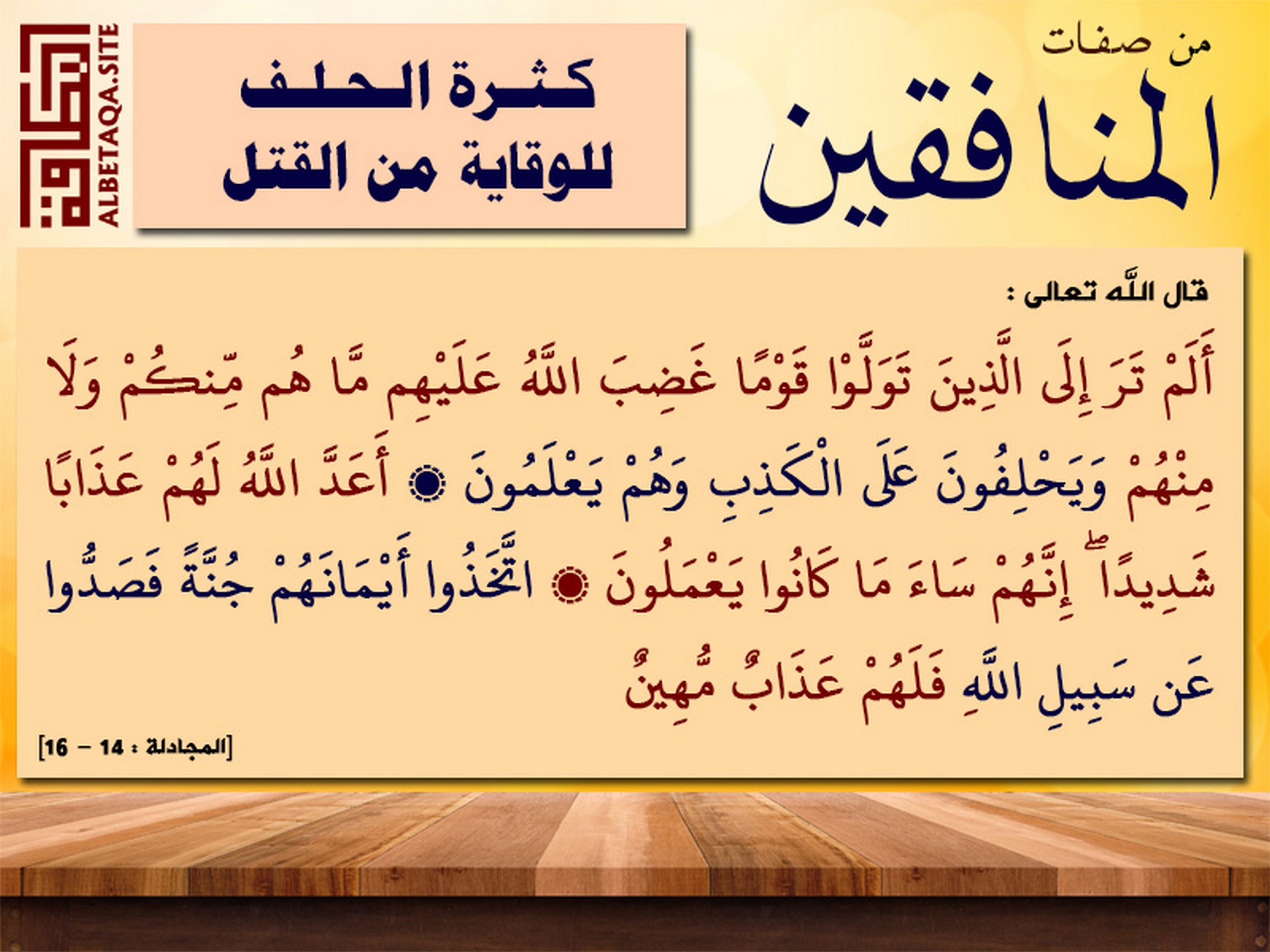 (ألم تر إلى الذين تولوا قوما غضب الله عليهم ما هم منكم ولا منهم ويحلفون على الكذب وهم يعلمون، أعد الله لهم عذابا شديدا إنهم ساء ما كانوا يعملون، اتخذوا أيمانهم جنة فصدوا عن سبيل الله فلهم عذاب مهين). [المجادلة: 14 – 16]