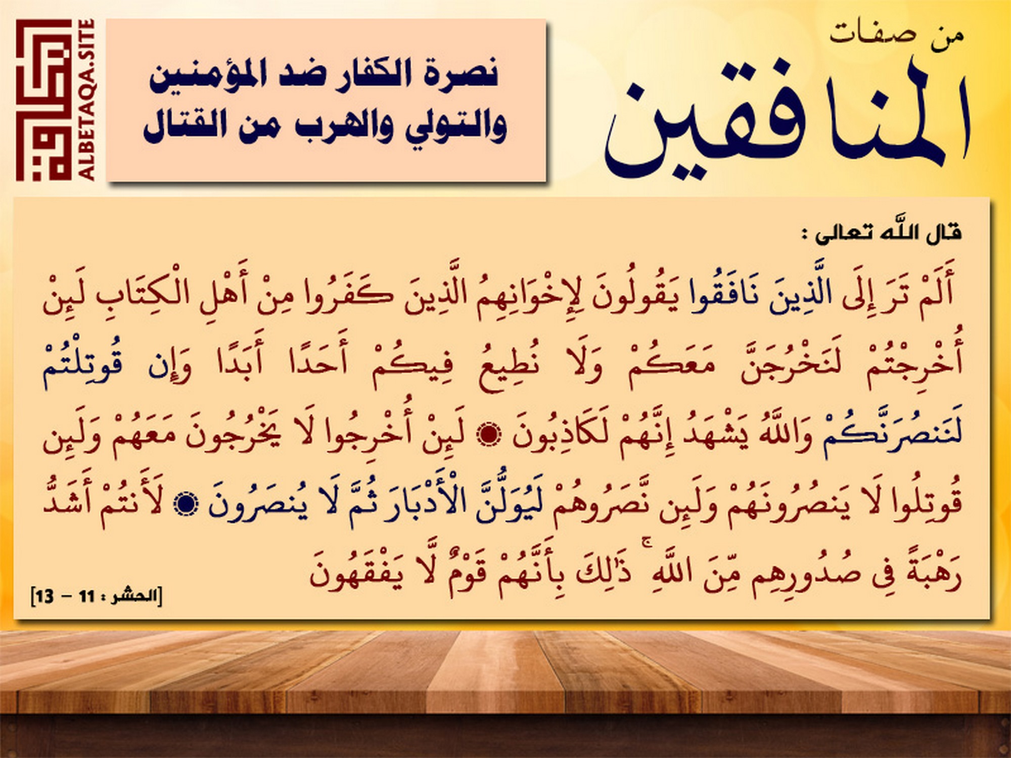 (ألم تر إلى الذين نافقوا يقولون لإخوانهم الذين كفروا من أهل الكتاب لئن أخرجتم لنخرجن معكم ولا نطيع فيكم أحدا أبدا وإن قوتلتم لننصرنكم والله يشهد إنهم لكاذبون ، لئن أخرجوا لا يخرجون معهم ولئن قوتلوا لا ينصرونهم ولئن نصروهم ليولن الأدبار ثم لا ينصرون، لأنتم أشد رهبة في صدورهم من الله ذلك بأنهم قوم لا يفقهون). [الحشر : 11 – 13]