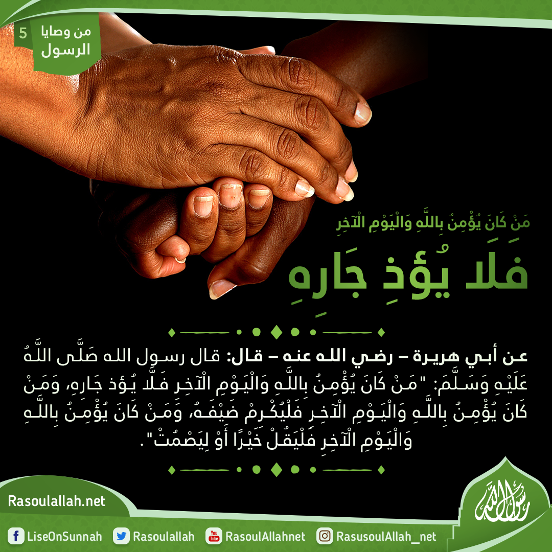 عن أبي هريرة – رضي الله عنه – قال: قال رسول الله صَلَّى اللَّهُ عَلَيْهِ وَسَلَّمَ: "مَنْ كَانَ يُؤْمِنُ بِاللَّهِ وَالْيَوْمِ الْآخِرِ فَلَّا يُؤذ جَارِهِ، وَمَنْ كَانَ يُؤْمِنُ بِاللَّهِ وَالْيَوْمِ الْآخِرِ فَلْيُكْرِمْ ضَيْفَهُ، وَمَنْ كَانَ يُؤْمِنُ بِاللَّهِ وَالْيَوْمِ الْآخِرِ فَلْيَقُلْ خَيْرًا أَوْ لِيَصْمُتْ".