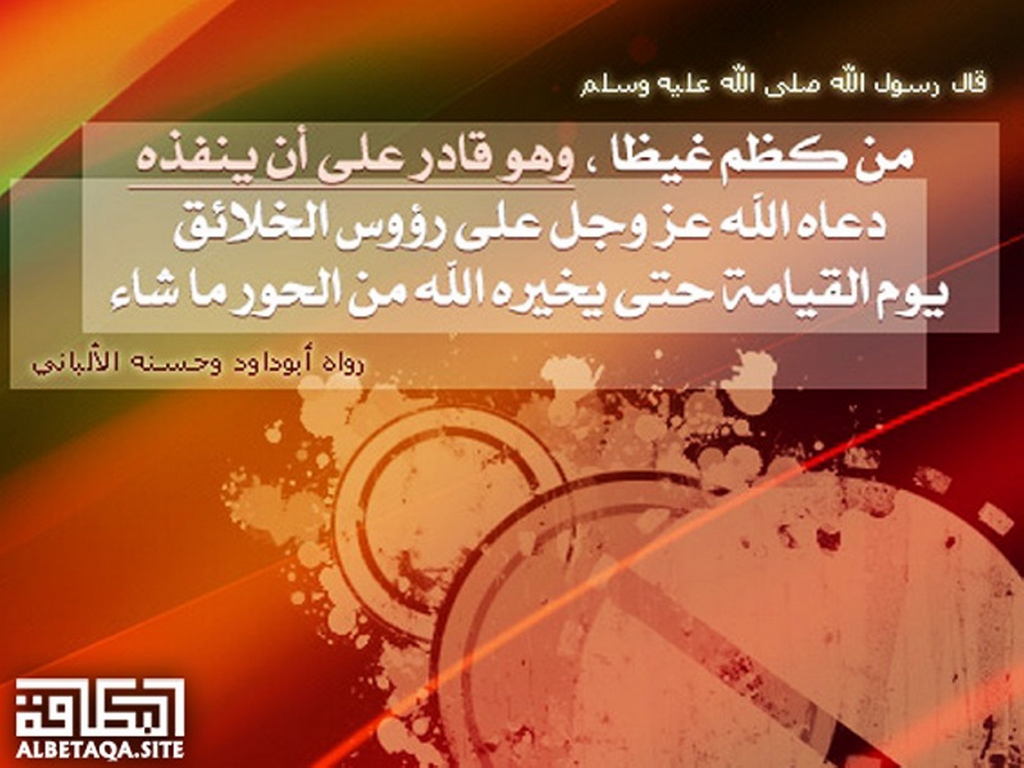 (من كظم غيظا وهو قادر على أن ينفذه دعاه الله عز وجل على رؤوس الخلائق يوم القيامة حتى يخيره من الحور ما شاء). رواه أبو داود وحسنه الألباني