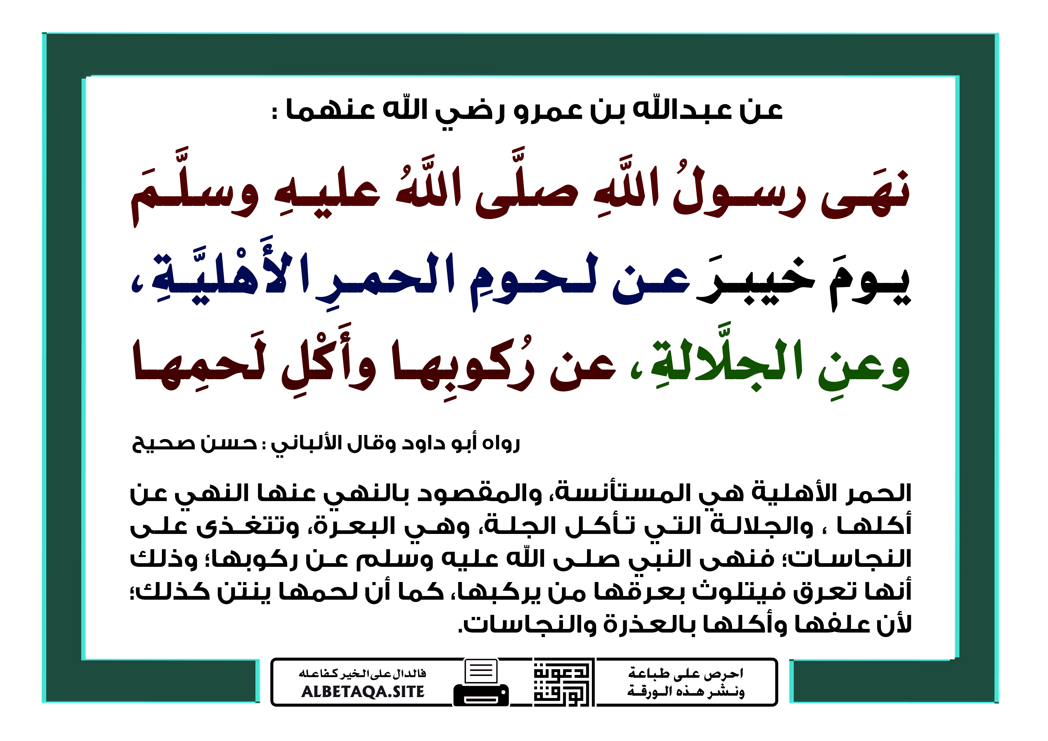 (نهى رسول الله صلى الله عليه وسلم: يوم خيبر عن لحوم الحمر الأهلية، وعن الجلالة، عن ركوبها وأكل لحمها). رواه أبو داود وقال الألباني: حسن صحيح