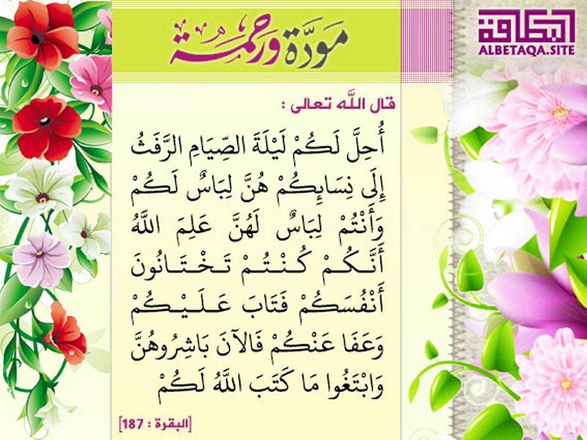 (أحل لكم ليلة الصيام الرفث إلى نسائكم هن لباس لكم وأنتم لباس لهن علم الله أنكم كنتم تختانون أنفسكم فتاب عليكم وعفا عنكم فالآن باشروهن وابتغوا ما كتب الله لكم). [البقرة : 187]